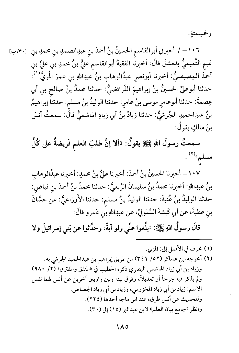 106 - / أخبرني أبو القاسمِ الحسينُ بنُ أحمدَ بنِ عبدِ الصمدِ بنِ محمدِ بنِ تميمٍ التَّميميُّ بدمشقَ قالَ: أخبرنا الفقيهُ أبو القاسمِ عليُّ بنُ محمدِ بنِ عليِّ بنِ أحمدَ المِصيصيُّ: أخبرنا أبو نصرٍ عبدُ الوهابِ بنُ عبدِ اللهِ بنِ عمرَ المُريُّ (¬1): حدثنا أبو عليٍّ الحسينُ بنُ إبراهيمَ الفَرائضيُّ: حدثنا محمدُ بنُ صالحِ بنِ أبي عِصمةَ: حدثنا أبو عامرٍ موسى بنُ عامرٍ: حدثنا الوليدُ بنُ مسلمٍ: حدثنا إبراهيمُ بنُ عبدِ الحميدِ الجُرشيُّ: حدثنا زيادُ بنُ أبي زيادٍ الهاشميُّ قالَ: سمعتُ أنسَ بنَ مالكٍ يقولُ:
