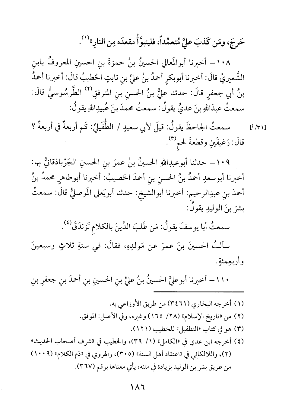 (¬4) أخرجه ابن عدي في «الكامل» (1/ 39)، والخطيب في «شرف أصحاب الحديث» (2)، واللالكائي في «اعتقاد أهل السنة» (305)، والهروي في «ذم الكلام» (1009) من طريق بشر بن الوليد بزيادة في متنه، يأتي معناها برقم (367).