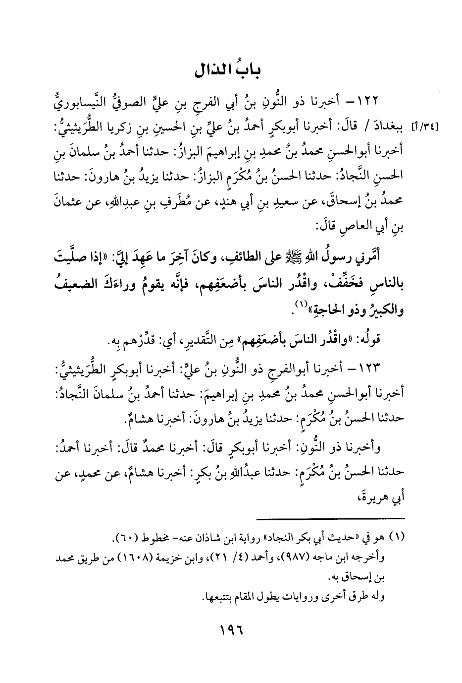122 - أخبرنا ذو النُّونِ بنُ أبي الفرجِ بنِ عليٍّ الصوفيُّ النَّيسابوريُّ ببغدادَ / قالَ: أخبرنا أبو بكرٍ أحمدُ بنُ عليِّ بنِ الحسينِ بنِ زكريا الطُّرَيثيثيُّ: أخبرنا أبو الحسنِ محمدُ بنُ محمدِ بنِ إبراهيمَ البزازُ: حدثنا أحمدُ بنُ سلمانَ بنِ الحسنِ النَّجادُ: حدثنا الحسنُ بنُ مُكْرَمٍ البزازُ: حدثنا يزيدُ بنُ هارونَ: حدثنا محمدُ بنُ إسحاقَ، عن سعيدِ بنِ أبي هندٍ، عن مُطَرفِ بنِ عبدِ اللهِ، عن عثمانَ بنِ أبي العاصِ قالَ: