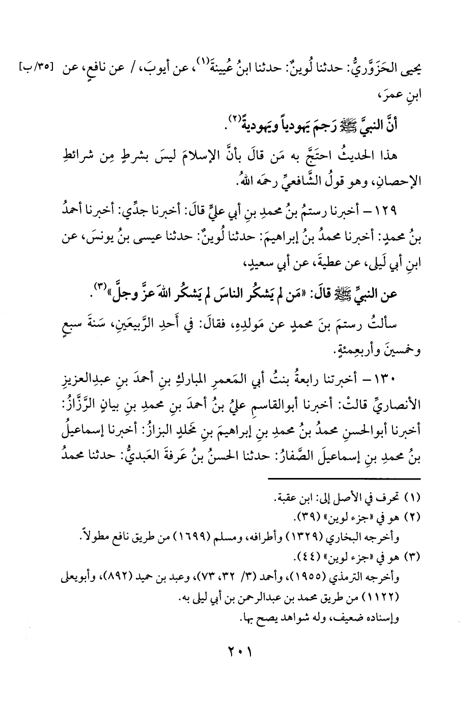130 - أخبرتنا رابعةُ بنتُ أبي المَعمرِ المباركِ بنِ أحمدَ بنِ عبدِ العزيزِ الأنصاريِّ قالتْ: أخبرنا أبو القاسمِ عليُ بنُ أحمدَ بنِ محمدِ بنِ بيانٍ الرَّزَّازُ: أخبرنا أبو الحسنِ محمدُ بنُ محمدِ بنِ إبراهيمَ بنِ مَخلدٍ البزازُ: أخبرنا إسماعيلُ بنُ محمدِ بنِ إسماعيلَ الصَّفارُ: حدثنا الحسنُ بنُ عَرفةَ العَبديُّ: حدثنا محمدُ