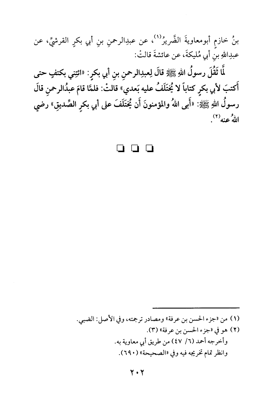 بنُ خازمٍ أبو معاويةَ الضَّريرُ (¬1)، عن عبدِ الرحمنِ بنِ أبي بكرٍ القرشيِّ، عن عبدِ اللهِ بنِ أبي مُليكةَ، عن عائشةَ قالتْ: