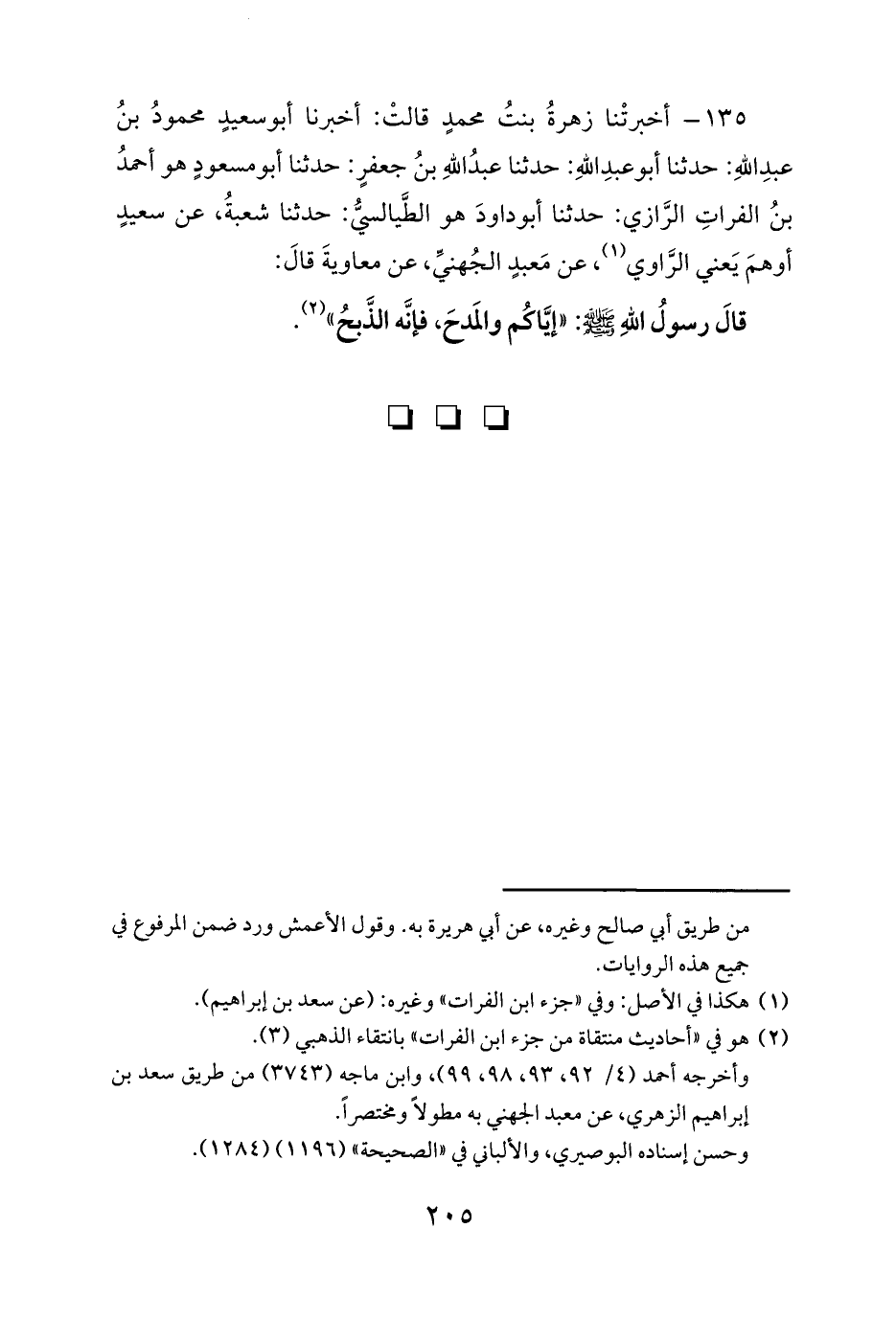 135 - أخبرتْنا زهرةُ بنتُ محمدٍ قالتْ: أخبرنا أبو سعيدٍ محمودُ بنُ عبدِ اللهِ: حدثنا أبو عبدِ اللهِ: حدثنا عبدُ اللهِ بنُ جعفرٍ: حدثنا أبو مسعودٍ هو أحمدُ بنُ الفراتِ الرَّازي: حدثنا أبو داودَ هو الطَّيالسيُّ: حدثنا شعبةُ، عن سعيدٍ أوهمَ يَعني الرَّاوي (¬1)، عن مَعبدٍ الجُهنيِّ، عن معاويةَ قالَ: