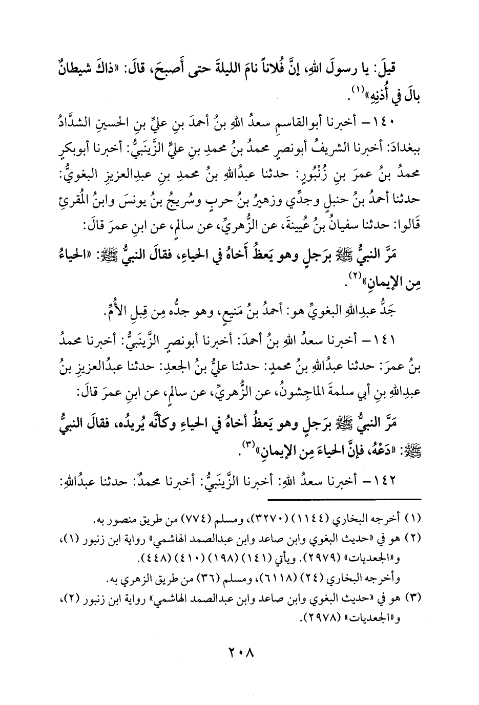 140 - أخبرنا أبو القاسمِ سعدُ اللهِ بنُ أحمدَ بنِ عليِّ بنِ الحسينِ الشدَّادُ ببغدادَ: أخبرنا الشريفُ أبو نصرٍ محمدُ بنُ محمدِ بنِ عليٍّ الزَّينَبيُّ: أخبرنا أبو بكرٍ محمدُ بنُ عمرَ بنِ زُنْبُورٍ: حدثنا عبدُ اللهِ بنُ محمدِ بنِ عبدِ العزيزِ البغويُّ: حدثنا أحمدُ بنُ حنبلٍ وجدِّي وزهيرُ بنُ حربٍ وسُريجُ بنُ يونسَ وابنُ المُقرئِ قَالوا: حدثنا سفيانُ بنُ عُيينةَ، عن الزُّهريِّ، عن سالمٍ، عن ابنِ عمرَ قالَ: