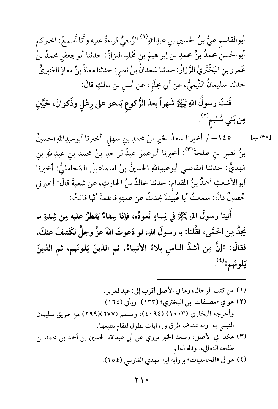 أبو القاسمِ عليُّ بنُ الحسينِ بنِ عبدِ اللهِ (¬1) الرَّبعيُّ قراءةً عليه وأَنا أَسمعُ: أخبركم أبو الحسنِ محمدُ بنُ محمدِ بنِ إبراهيمَ بنِ مَخلدٍ البزازُ: حدثنا أبو جعفرٍ محمدُ بنُ عَمرو بنِ البَخْتَريِّ الرَّزازُ: حدثنا سَعدانُ بنُ نصرٍ: حدثنا معاذُ بنُ معاذٍ العَنبريُّ: حدثنا سليمانُ التَّيميُّ، عن أبي مجلَزٍ، عن أنسِ بنِ مالكٍ قالَ: