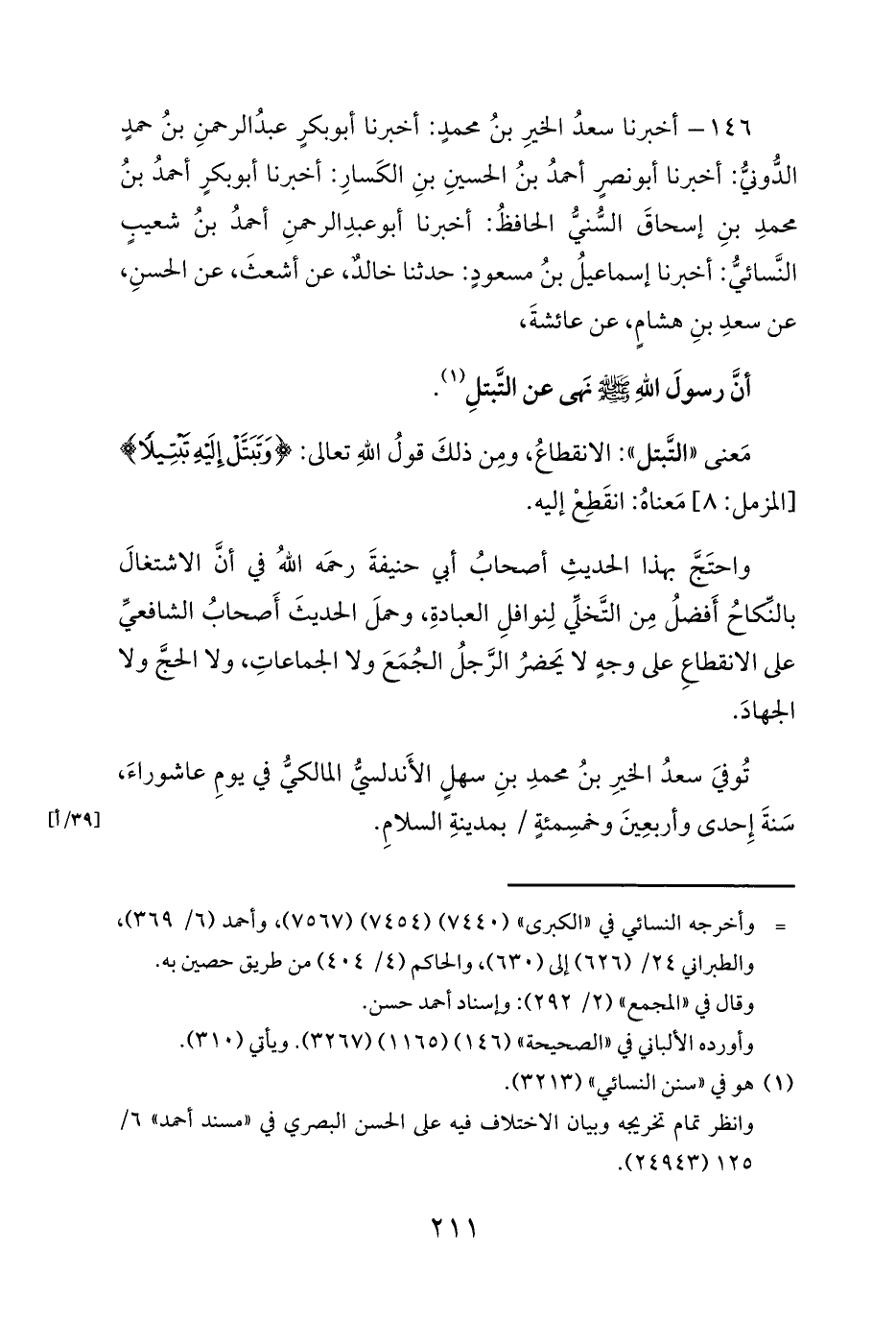 146 - أخبرنا سعدُ الخيرِ بنُ محمدٍ: أخبرنا أبو بكرٍ عبدُ الرحمنِ بنُ حمدٍ الدُّونيُّ: أخبرنا أبو نصرٍ أحمدُ بنُ الحسينِ بنِ الكَسارِ: أخبرنا أبو بكرٍ أحمدُ بنُ محمدِ بنِ إسحاقَ السُّنيُّ الحافظُ: أخبرنا أبو عبدِ الرحمنِ أحمدُ بنُ شعيبٍ النَّسائيُّ: أخبرنا إسماعيلُ بنُ مسعودٍ: حدثنا خالدٌ، عن أشعثَ، عن الحسنِ، عن سعدِ بنِ هشامٍ، عن عائشةَ،