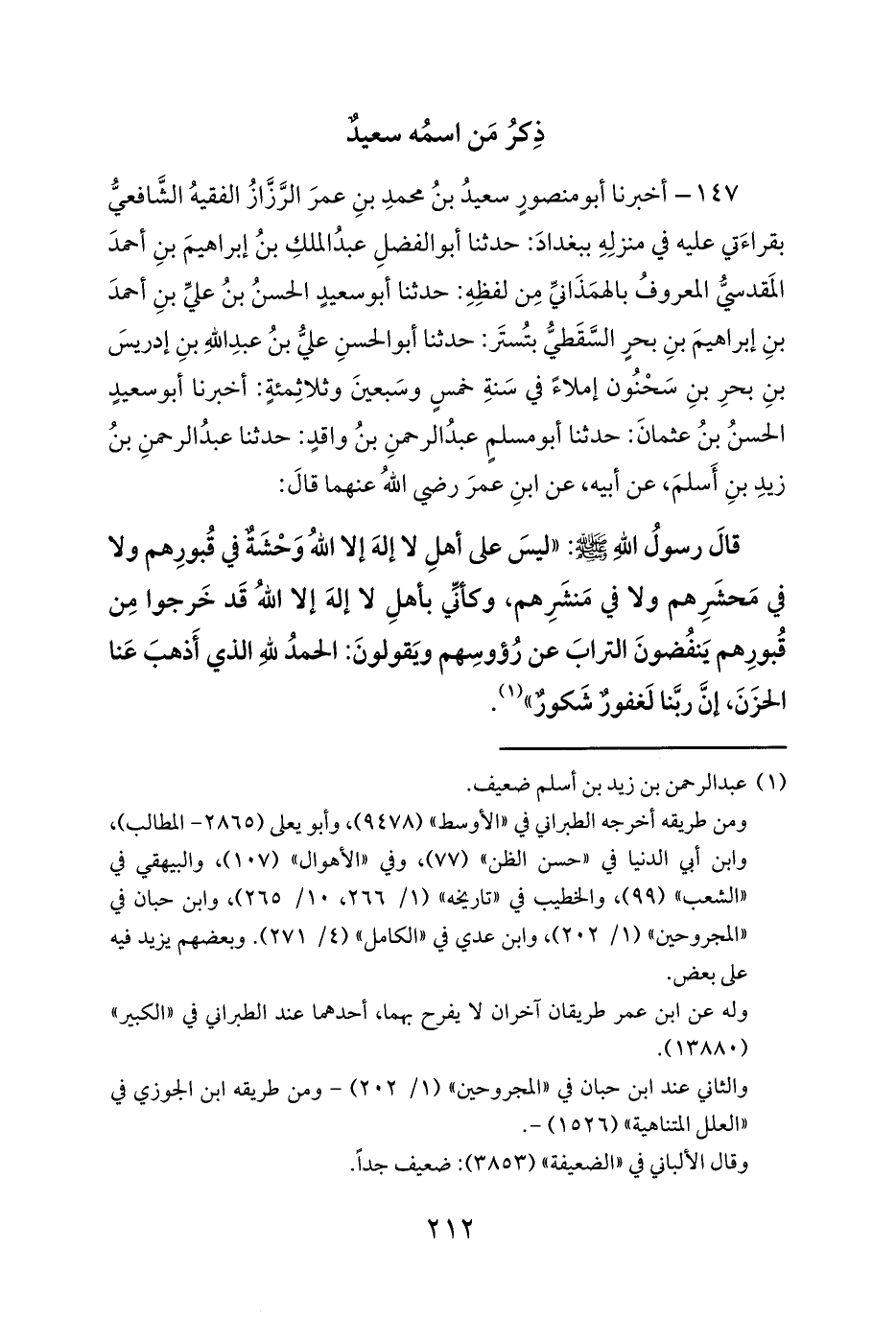 147 - أخبرنا أبو منصورٍ سعيدُ بنُ محمدِ بنِ عمرَ الرَّزَّازُ الفقيهُ الشَّافعيُّ بقراءَتي عليه في منزلِهِ ببغدادَ: حدثنا أبو الفضلِ عبدُ الملكِ بنُ إبراهيمَ بنِ أحمدَ المَقدسيُّ المعروفُ بالهمَذَانيِّ مِن لفظِهِ: حدثنا أبو سعيدٍ الحسنُ بنُ عليِّ بنِ أحمدَ بنِ إبراهيمَ بنِ بحرٍ السَّقَطيُّ بتُستَر: حدثنا أبو الحسنِ عليُّ بنُ عبدِ اللهِ بنِ إدريسَ بنِ بحرِ بنِ سَحْنُون إملاءً في سَنةِ خمسٍ وسَبعينَ وثلاثِمئةٍ: أخبرنا أبو سعيدٍ الحسنُ بنُ عثمانَ: حدثنا أبو مسلمٍ عبدُ الرحمنِ بنُ واقدٍ: حدثنا عبدُ الرحمنِ بنُ زيدِ بنِ أَسلمَ، عن أبيه، عن ابنِ عمرَ رضي اللهُ عنهما قالَ: