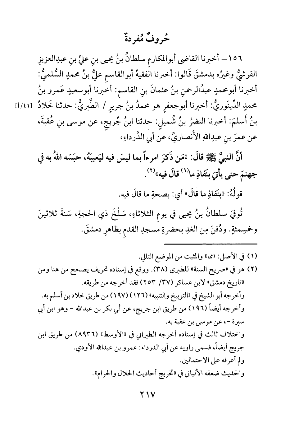 156 - أخبرنا القاضي أبو المكارمِ سلطانُ بنُ يحيى بنِ عليِّ بنِ عبدِ العزيزِ القرشيُّ وغيرُه بدمشقَ قَالوا: أخبرنا الفقيهُ أبو القاسمِ عليُّ بنُ محمدٍ السُّلميُّ: أخبرنا أبو محمدٍ عبدُ الرحمنِ بنُ عثمانَ بنِ القاسمِ: أخبرنا أبو سعيدٍ عَمرو بنُ محمدٍ الدِّينَوريُّ: أخبرنا أبو جعفرٍ هو محمدُ بنُ جريرٍ / الطَّبريُّ: حدثنا خَلادُ بنُ أَسلمَ: أخبرنا النضرُ بنُ شُميلٍ: حدثنا ابنُ جُريجٍ، عن موسى بنِ عُقبةَ، عن عمرَ بنِ عبدِ اللهِ الأَنصاريِّ، عن أبي الدَّرداءِ،