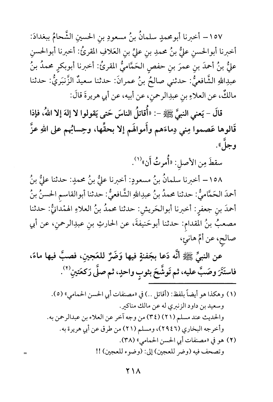 (¬1) وهكذا هو أيضاً بلفظ: (أقاتل ..) في «مصنفات أبي الحسن الحمامي» (5).