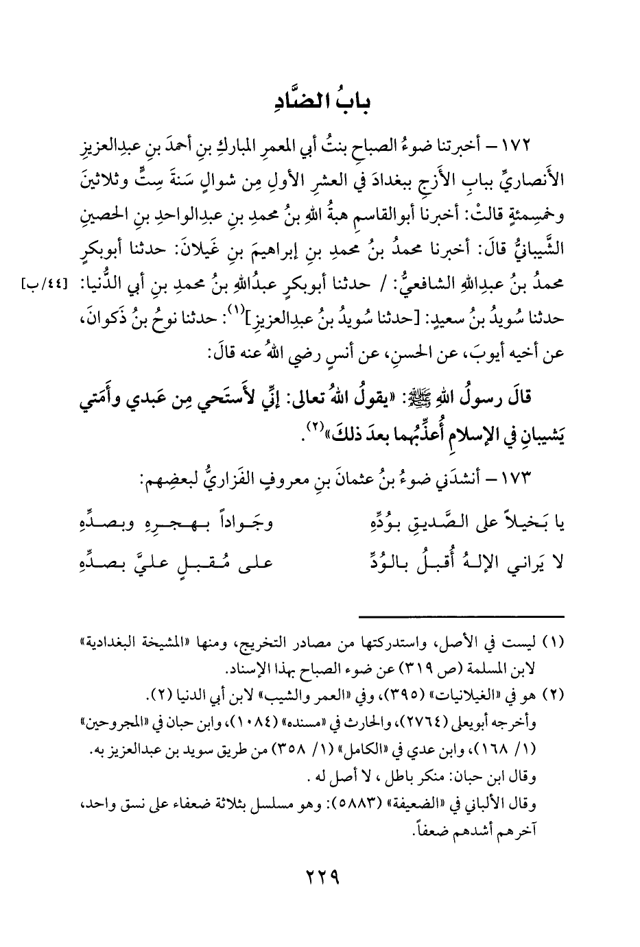172 - أخبرتنا ضوءُ الصباحِ بنتُ أبي المعمرِ المباركِ بنِ أحمدَ بنِ عبدِ العزيزِ الأَنصاريِّ ببابِ الأَزجِ ببغدادَ في العشرِ الأولِ مِن شوالٍ سَنةَ سِتٍّ وثلاثينَ وخمسِمئةٍ قالتْ: أخبرنا أبو القاسمِ هبةُ اللهِ بنُ محمدِ بنِ عبدِ الواحدِ بنِ الحصينِ الشَّيبانيُّ قالَ: أخبرنا محمدُ بنُ محمدِ بنِ إبراهيمَ بنِ غَيلانَ: حدثنا أبو بكرٍ محمدُ بنُ عبدِ اللهِ الشافعيُّ: / حدثنا أبو بكرٍ عبدُ اللهِ بنُ محمدِ بنِ أبي الدُّنيا: حدثنا سُويدُ بنُ سعيدٍ: [حدثنا سُويدُ بنُ عبدِ العزيزِ] (¬1): حدثنا نوحُ بنُ ذَكوانَ، عن أخيه أيوبَ، عن الحسنِ، عن أنسٍ رضي اللهُ عنه قالَ: