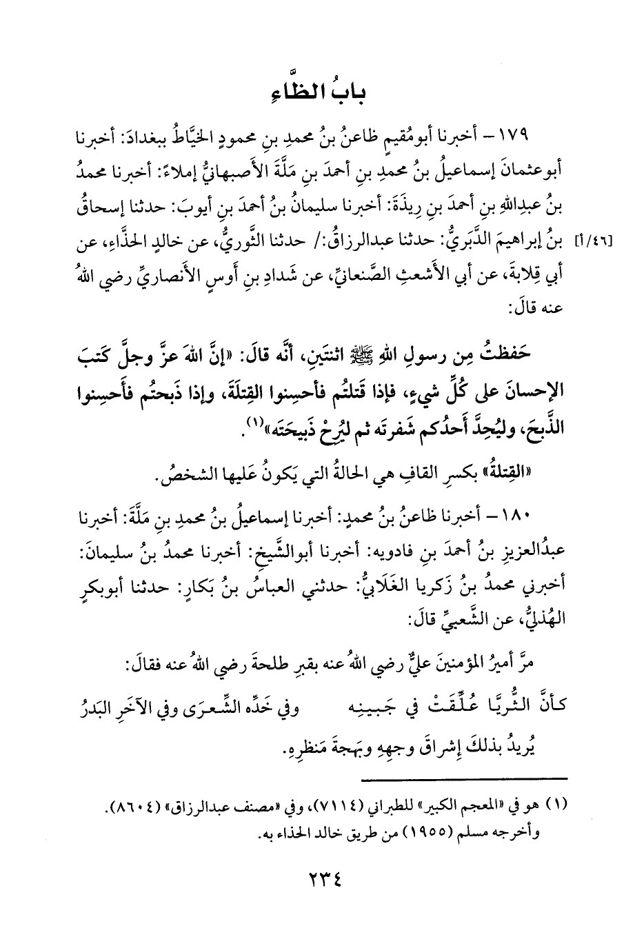 179 - أخبرنا أبو مُقيمٍ ظاعنُ بنُ محمدِ بنِ محمودٍ الخيَّاطُ ببغدادَ: أخبرنا أبو عثمانَ إسماعيلُ بنُ محمدِ بنِ أحمدَ بنِ مَلَّةَ الأَصبهانيُّ إملاءً: أخبرنا محمدُ بنُ عبدِ اللهِ بنِ أحمدَ بنِ رِيذَةَ: أخبرنا سليمانُ بنُ أحمدَ بنِ أيوبَ: حدثنا إسحاقُ بنُ إبراهيمَ الدَّبَريُّ: حدثنا عبد الرزاقُ:/ حدثنا الثَّوريُّ، عن خالدٍ الحذَّاءِ، عن أبي قِلابةَ، عن أبي الأَشعثِ الصَّنعانيِّ، عن شَدادِ بنِ أَوسٍ الأَنصاريِّ رضي اللهُ عنه قالَ:
