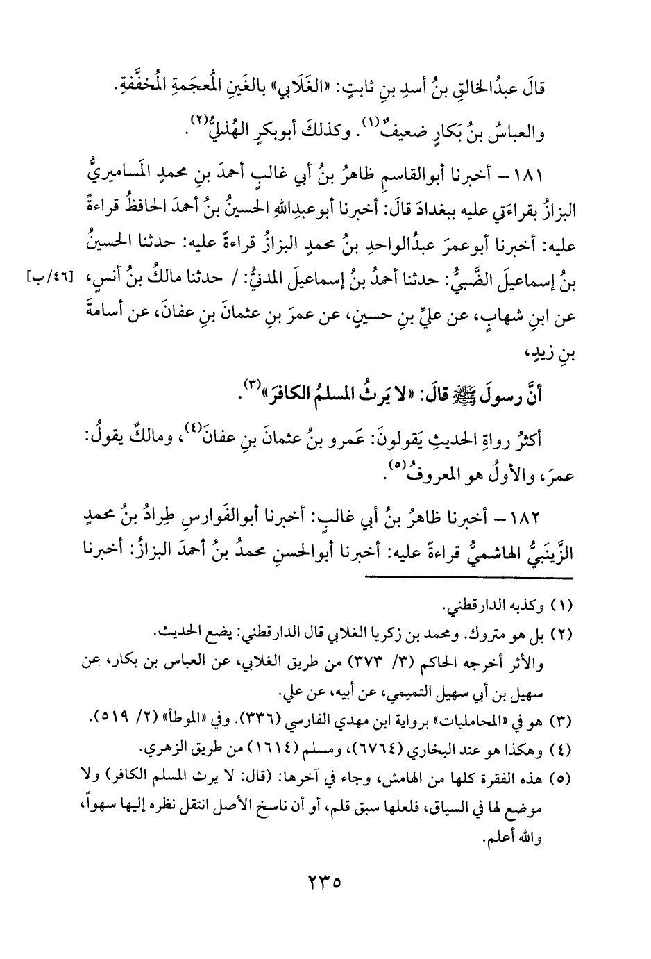 (¬5) هذه الفقرة كلها من الهامش، وجاء في آخرها: (قال: لا يرث المسلم الكافر) ولا موضع لها في السياق، فلعلها سبق قلم، أو أن ناسخ الأصل انتقل نظره إليها سهواً، والله أعلم.