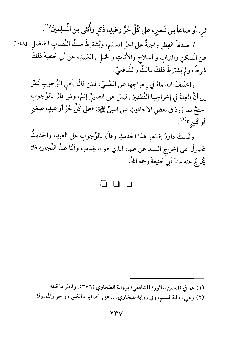 / صدقةُ الفِطرِ واجبةٌ على الحرِّ المسلمِ، ويُشترطُ ملكُ النِّصابِ الفاضلِ عن المَسكنِ والثيابِ والسلاحِ والأَثاثِ والخيلِ والعَبيدِ، عن أبي حَنفيةَ ذلكَ شَرطٌ، ولم يَشترطْ ذلكَ مالكٌ والشَّافعيُّ.