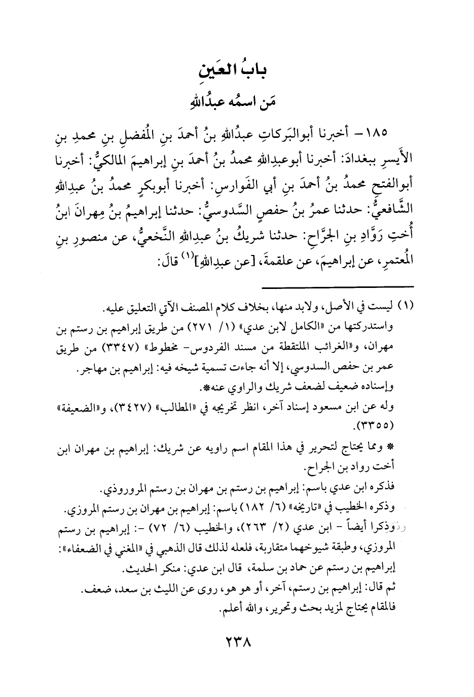 185 - أخبرنا أبو البَركاتِ عبدُ اللهِ بنُ أحمدَ بنِ المُفضلِ بنِ محمدِ بنِ الأَيسرِ ببغدادَ: أخبرنا أبو عبدِ اللهِ محمدُ بنُ أحمدَ بنِ إبراهيمَ المالكيُّ: أخبرنا أبو الفتحِ محمدُ بنُ أحمدَ بنِ أبي الفَوارسِ: أخبرنا أبو بكرٍ محمدُ بنُ عبدِ اللهِ الشَّافعيُّ: حدثنا عمرُ بنُ حفصٍ السَّدوسيُّ: حدثنا إبراهيمُ بنُ مِهرانَ ابنُ أُختِ رَوَّادِ بنِ الجرَّاحِ: حدثنا شريكُ بنُ عبدِ اللهِ النَّخعيُّ، عن منصورِ بنِ المُعتمرِ، عن إبراهيمَ، عن علقمةَ، [عن عبدِ اللهِ] (¬1) قالَ: