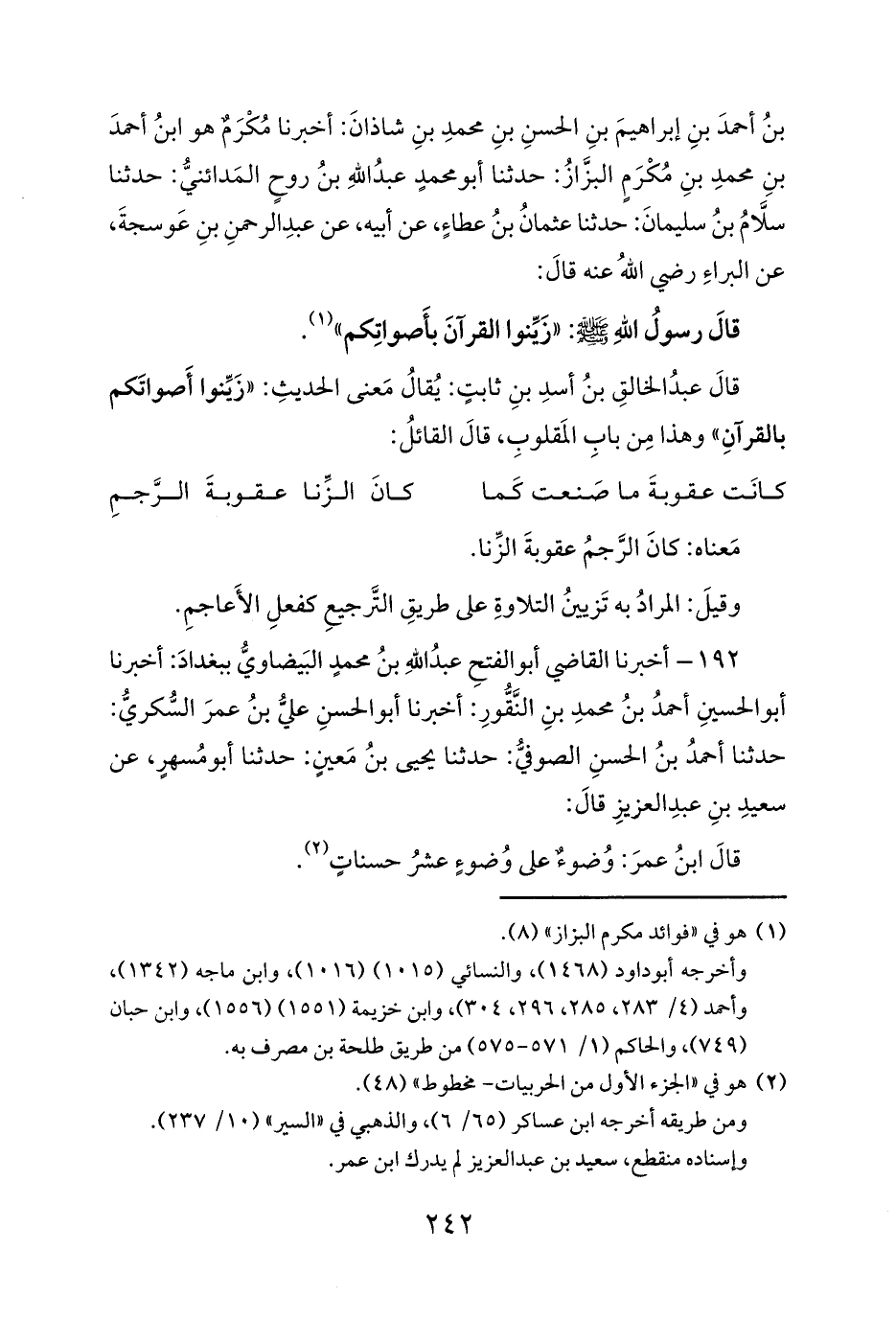 قالَ رسولُ اللهِ صلى الله عليه وسلم: «زَيِّنوا القرآنَ بأَصواتِكم» (¬1).