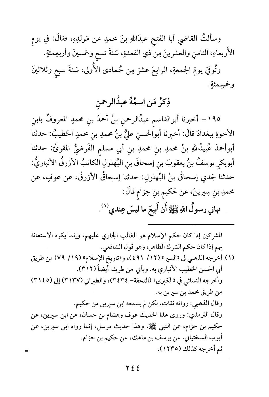 195 - أخبرنا أبو القاسمِ عبدُ الرحمنِ بنُ أحمدَ بنِ محمدٍ المعروفُ بابنِ الأخوةِ ببغدادَ قالَ: أخبرنا أبو الحسنِ عليُّ بنُ محمدِ بنِ محمدٍ الخطيبُ: حدثنا أبو أحمدَ عُبيدُ اللهِ بنُ محمدِ بنِ محمدِ بنِ أبي مسلمٍ الفَرضيُّ المقرئُ: حدثنا أبو بكرٍ يوسفُ بنُ يعقوبَ بنِ إسحاقَ بنِ البُهلولِ الكاتبُ الأزرقُ الأنباريُّ: حدثنا جَدي إسحاقُ بنُ البُهلولِ: حدثنا إسحاقُ الأزرقُ، عن عوفٍ، عن محمدِ بنِ سِيرينَ، عن حَكيمِ بنِ حِزامٍ قالَ: