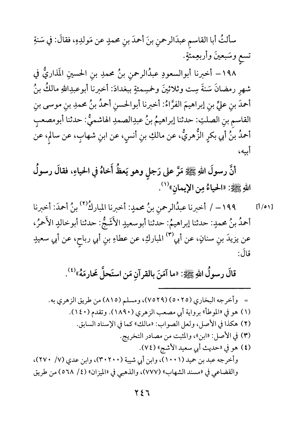 198 - أخبرنا أبو السعودِ عبدُ الرحمنِ بنُ محمدِ بنِ الحسينِ المَذاريُّ في شهرِ رمضانَ سَنةَ سِت وثلاثينَ وخمسِمئةٍ ببغدادَ: أخبرنا أبو عبدِ اللهِ مالكُ بنُ أحمدَ بنِ عليِّ بنِ إبراهيمَ الفرَّاءُ: أخبرنا أبو الحسنِ أحمدُ بنُ محمدِ بنِ موسى بنِ القاسمِ بنِ الصلتِ: حدثنا إبراهيمُ بنُ عبدِ الصمدِ الهاشميُّ: حدثنا أبو مصعبٍ أحمدُ بنُ أبي بكرٍ الزُّهريُّ، عن مالكِ بنِ أنسٍ، عن ابنِ شهابٍ، عن سالمٍ، عن أبيه،