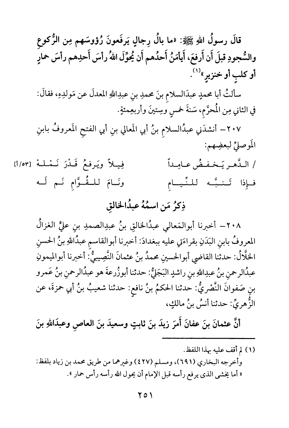 208 - أخبرنا أبو المَعالي عبدُ الخالقِ بنُ عبدِ الصمدِ بنِ عليٍّ الغزالُ المعروفُ بابنِ البَدَنِ بقراءَتي عليه ببغدادَ: أخبرنا أبو القاسمِ عبدُ اللهِ بنُ الحسنِ الخلَّالُ: حدثنا القاضي أبو الحسينِ محمدُ بنُ عثمانَ النَّصِيبيُّ: أخبرنا أبو الميمونِ عبدُ الرحمنِ بنُ عبدِ اللهِ بنِ راشدٍ البَجَليُّ: حدثنا أبو زُرعةَ هو عبدُ الرحمنِ بنُ عَمرو بنِ صَفوانَ النَّصْريُّ: حدثنا الحكمُ بنُ نافعٍ: حدثنا شعيبُ بنُ أبي حمزةَ، عن الزُّهريِّ: حدثنا أنسُ بنُ مالكٍ،