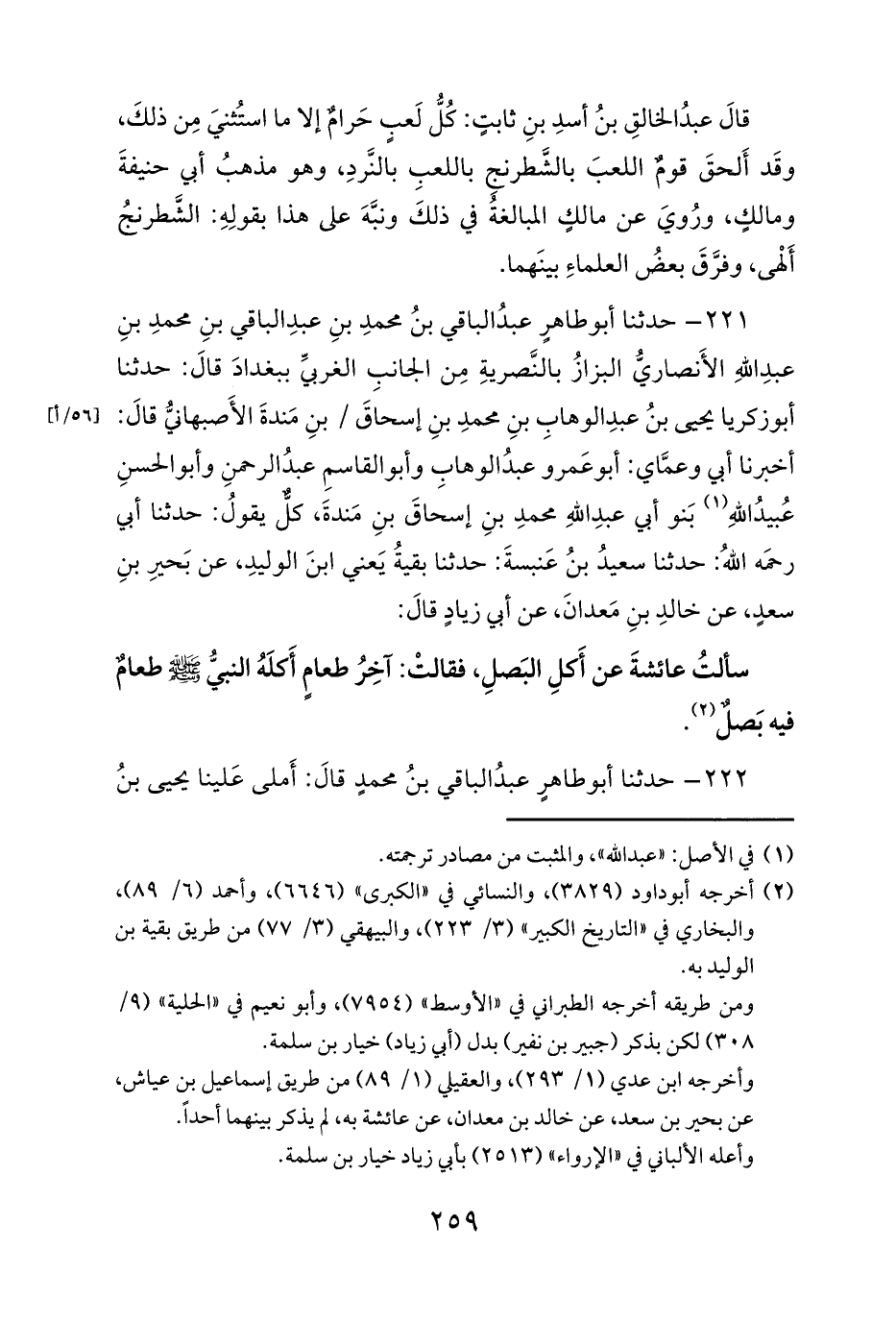 222 - حدثنا أبو طاهرٍ عبدُ الباقي بنُ محمدٍ قالَ: أَملى عَلينا يحيى بنُ