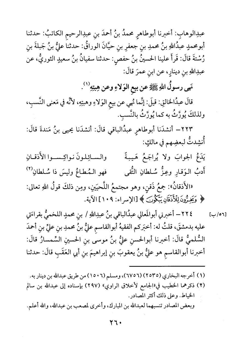 224 - أخبرني أبو المَعالي عبدُ الباقي بنُ عبدِ اللهِ / بنِ محمدٍ اللخميُّ بقراءَتي عليه بدمشقَ، قلتُ له: أخبَركم الفقيهُ أبو القاسمِ عليُّ بنُ محمدِ بنِ عليِّ بنِ أحمدَ السُّلميُّ قالَ: أخبرنا أبو الحسنِ عليُّ بنُ موسى بنِ الحسينِ السِّمسارُ قالَ: أخبرنا أبو القاسمِ هو عليُّ بنُ يعقوبَ بنِ إبراهيمَ بنِ أبي العَقَبِ قالَ: حدثنا