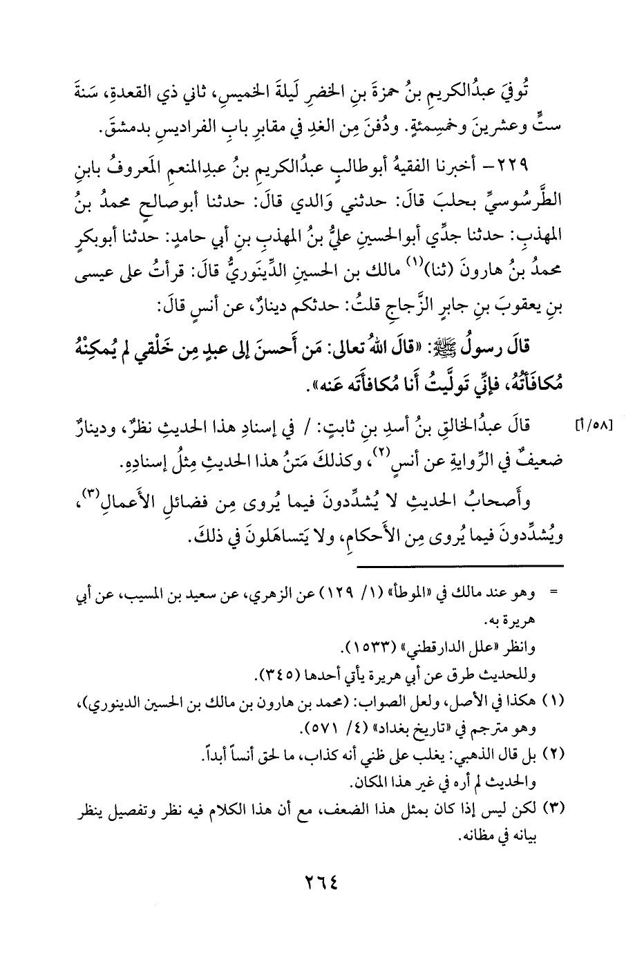 229 - أخبرنا الفقيهُ أبو طالبٍ عبدُ الكريمِ بنُ عبدِ المنعمِ المَعروفُ بابنِ الطَّرسُوسيِّ بحلبَ قالَ: حدثني وَالدي قالَ: حدثنا أبو صالحٍ محمدُ بنُ المهذبِ: حدثنا جدِّي أبو الحسينِ عليُّ بنُ المهذبِ بنِ أبي حامدٍ: حدثنا أبو بكرٍ محمدُ بنُ هارونَ (ثنا) (¬1) مالك بن الحسينِ الدِّينَوريُّ قالَ: قرأتُ على عيسى بنِ يعقوبَ بنِ جابرٍ الزَّجاجِ قلتُ: حدثكم دينارٌ، عن أنسٍ قالَ: