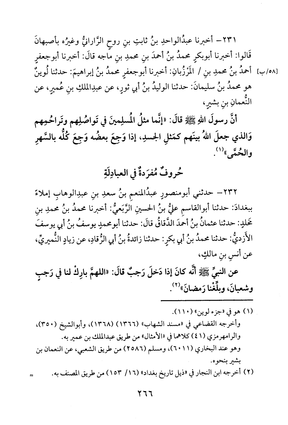 231 - أخبرنا عبدُ الواحدِ بنُ ثابتِ بنِ روحٍ الرَّارانيُّ وغيرُه بأصبهانَ قَالوا: أخبرنا أبو بكرٍ محمدُ بنُ أحمدَ بنِ محمدِ بنِ ماجه قالَ: أخبرنا أبو جعفرٍ أحمدُ بنُ محمدِ بنِ / المَرْزُبانِ: أخبرنا أبو جعفرٍ محمدُ بنُ إبراهيمَ: حدثنا لُوينٌ هو محمدُ بنُ سليمانَ: حدثنا الوليدُ بنُ أبي ثورٍ، عن عبدِ الملكِ بنِ عُميرٍ، عن النُّعمانِ بنِ بشيرٍ،