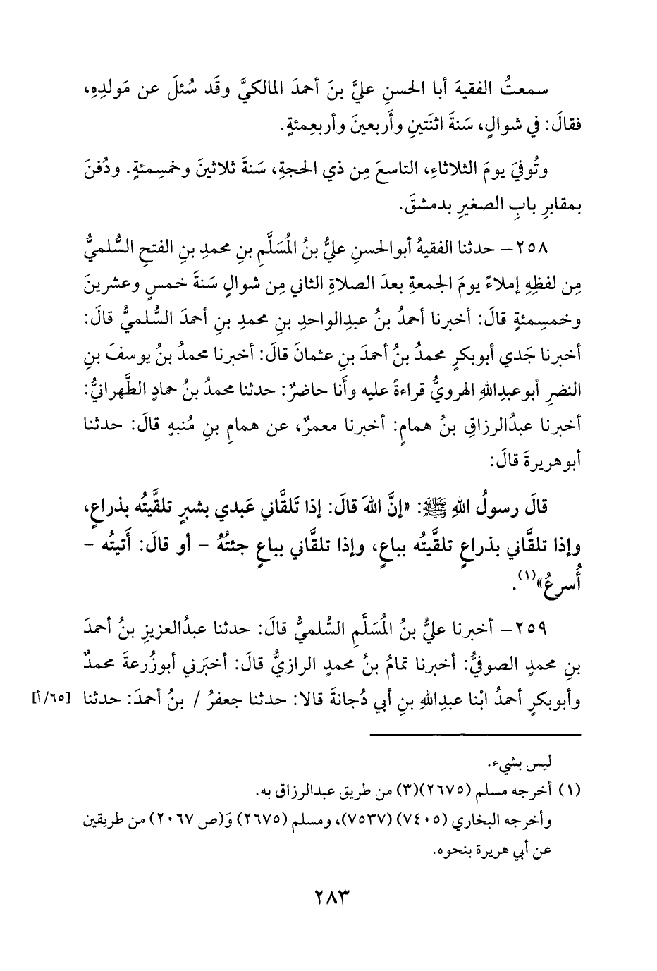 258 - حدثنا الفقيهُ أبو الحسنِ عليُّ بنُ المُسَلَّمِ بنِ محمدِ بنِ الفتحِ السُّلميُّ مِن لفظِهِ إملاءً يومَ الجمعةِ بعدَ الصلاةِ الثاني مِن شوالٍ سَنةَ خمسٍ وعشرينَ وخمسِمئةٍ قالَ: أخبرنا أحمدُ بنُ عبدِ الواحدِ بنِ محمدِ بنِ أحمدَ السُّلميُّ قالَ: أخبرنا جَدي أبو بكرٍ محمدُ بنُ أحمدَ بنِ عثمانَ قالَ: أخبرنا محمدُ بنُ يوسفَ بنِ النضرِ أبو عبدِ اللهِ الهرويُّ قراءةً عليه وأَنا حاضرٌ: حدثنا محمدُ بنُ حمادٍ الطَّهرانيُّ: أخبرنا عبدُ الرزاقِ بنُ همامٍ: أخبرنا معمرٌ، عن همامِ بنِ مُنبهٍ قالَ: حدثنا أبو هريرةَ قالَ: