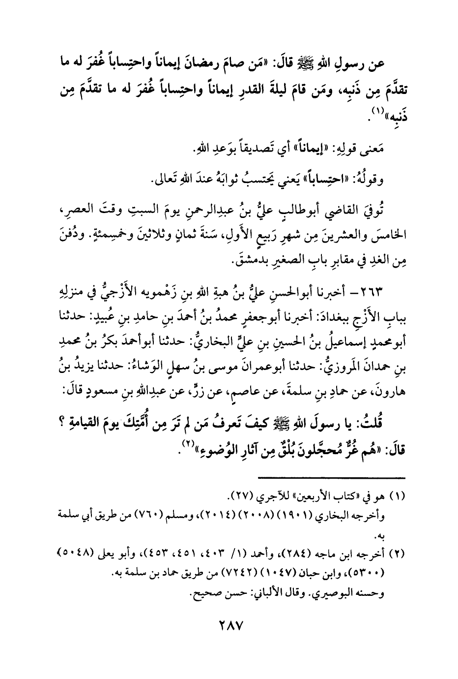 263 - أخبرنا أبو الحسنِ عليُّ بنُ هبةِ اللهِ بنِ زَهْمويه الأَزْجيُّ في منزلِهِ ببابِ الأَزْجِ ببغدادَ: أخبرنا أبو جعفرٍ محمدُ بنُ أحمدَ بنِ حامدِ بنِ عُبيدٍ: حدثنا أبو محمدٍ إسماعيلُ بنُ الحسينِ بنِ عليٍّ البخاريُّ: حدثنا أبو أحمدَ بكرُ بنُ محمدِ بنِ حمدانَ المَروزيُّ: حدثنا أبو عمرانَ موسى بنُ سهلٍ الوَشاءُ: حدثنا يزيدُ بنُ هارونَ، عن حمادِ بنِ سلمةَ، عن عاصمٍ، عن زرٍّ، عن عبدِ اللهِ بنِ مسعودٍ قالَ: