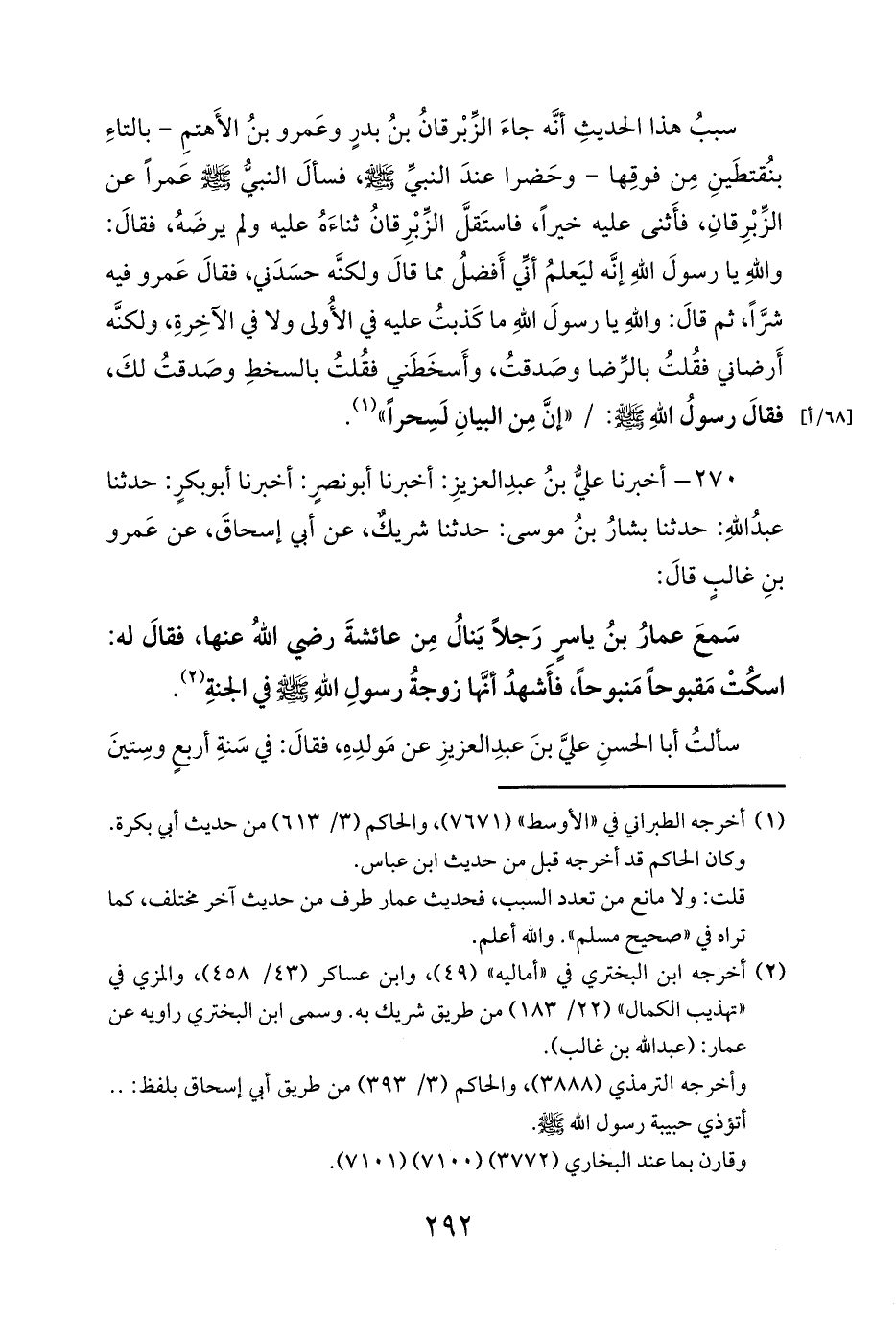 سببُ هذا الحديثِ أنَّه جاءَ الزِّبْرقانُ بنُ بدرٍ وعَمرو بنُ الأَهتمِ - بالتاءِ بنُقتطَينِ مِن فوقِها - وحَضرا عندَ النبيِّ صلى الله عليه وسلم، فسألَ النبيُّ صلى الله عليه وسلم عَمراً عن الزِّبْرِقانِ، فأَثنى عليه خيراً، فاستَقلَّ الزِّبْرِقانُ ثناءَهُ عليه ولم يرضَهُ، فقالَ: واللهِ يا رسولَ اللهِ إنَّه ليَعلمُ أنِّي أَفضلُ مما قالَ ولكنَّه حسَدَني، فقالَ عَمرو فيه شرَّاً، ثم قالَ: واللهِ يا رسولَ اللهِ ما كَذبتُ عليه في الأُولى ولا في الآخِرةِ، ولكنَّه أَرضاني فقُلتُ بالرِّضا وصَدقتُ، وأَسخَطَني فقُلتُ بالسخطِ وصَدقتُ لكَ، فقالَ رسولُ اللهِ صلى الله عليه وسلم: / «إنَّ مِن البيانِ لَسِحراً» (¬1).