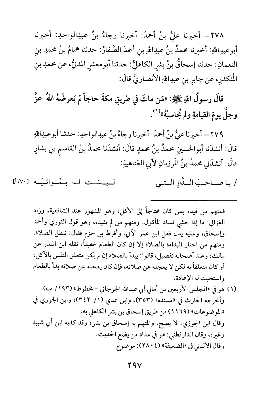 278 - أخبرنا عليُّ بنُ أحمدَ: أخبرنا رجاءُ بنُ عبدِ الواحدِ: أخبرنا أبو عبدِ اللهِ: أخبرنا محمدُ بنُ عبدِ اللهِ بنِ أحمدَ الصَّفارُ: حدثنا همامُ بنُ محمدِ بنِ النعمانِ: حدثنا إسحاقُ بنُ بشرٍ الكاهليُّ: حدثنا أبو معشرٍ المدنيُّ، عن محمدِ بنِ المُنكدرِ، عن جابرِ بنِ عبدِ اللهِ الأنصاريِّ قالَ: