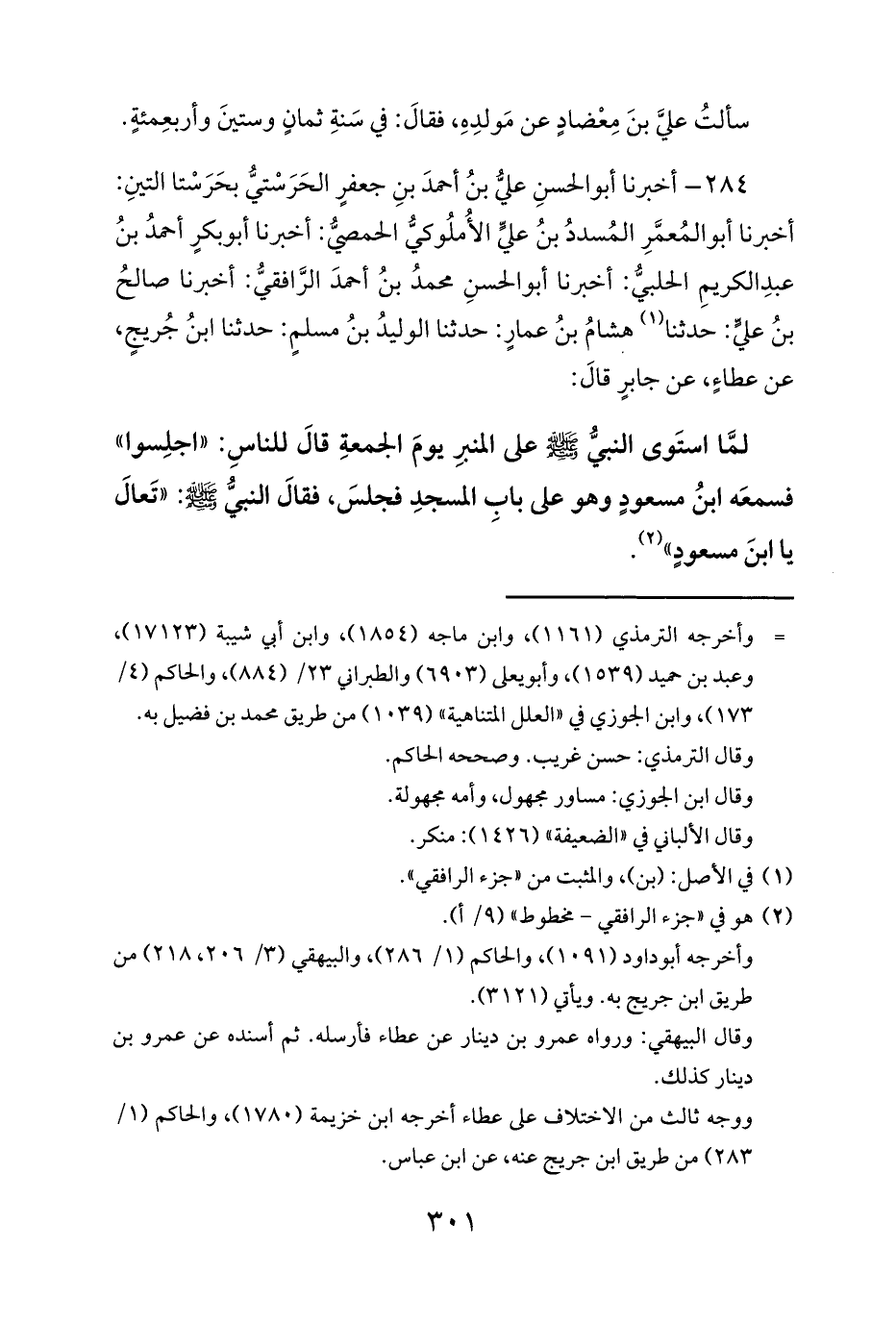 284 - أخبرنا أبو الحسنِ عليُّ بنُ أحمدَ بنِ جعفرٍ الحَرَسْتيُّ بحَرَسْتا التينِ: أخبرنا أبو المُعمَّرِ المُسددُ بنُ عليٍّ الأُملُوكيُّ الحمصيُّ: أخبرنا أبو بكرٍ أحمدُ بنُ عبدِ الكريمِ الحلبيُّ: أخبرنا أبو الحسنِ محمدُ بنُ أحمدَ الرَّافقيُّ: أخبرنا صالحُ بنُ عليٍّ: حدثنا (¬1) هشامُ بنُ عمارٍ: حدثنا الوليدُ بنُ مسلمٍ: حدثنا ابنُ جُريجٍ، عن عطاءٍ، عن جابرٍ قالَ: