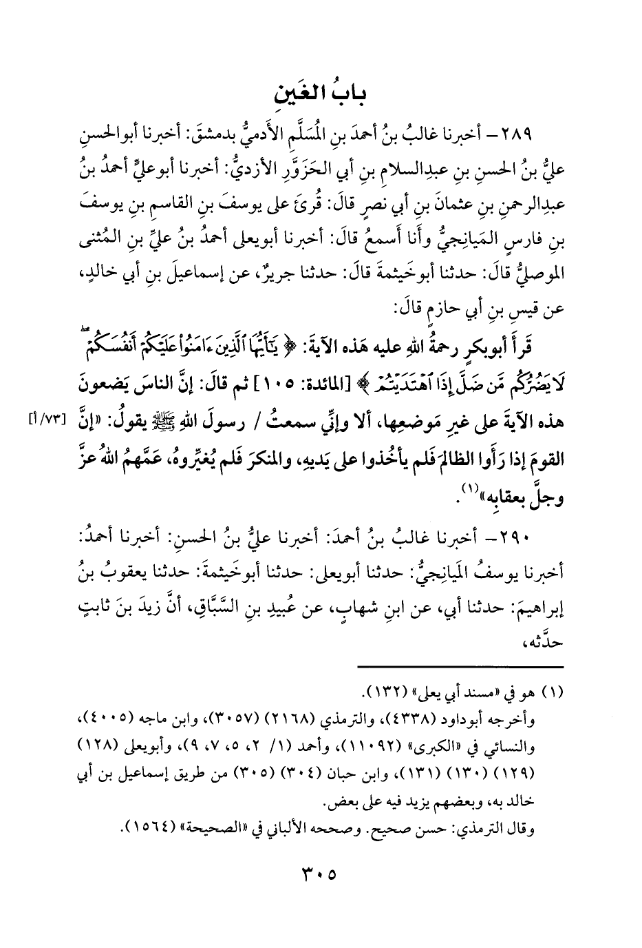 289 - أخبرنا غالبُ بنُ أحمدَ بنِ المُسَلَّمِ الأَدميُّ بدمشقَ: أخبرنا أبو الحسنِ عليُّ بنُ الحسنِ بنِ عبدِ السلامِ بنِ أبي الحَزَوَّرِ الأزديُّ: أخبرنا أبو عليٍّ أحمدُ بنُ عبدِ الرحمنِ بنِ عثمانَ بنِ أبي نصرٍ قالَ: قُرئَ على يوسفَ بنِ القاسمِ بنِ يوسفَ بنِ فارسٍ المَيانِجيُّ وأَنا أَسمعُ قالَ: أخبرنا أبو يعلى أحمدُ بنُ عليِّ بنِ المُثنى الموصليُّ قالَ: حدثنا أبو خَيثمةَ قالَ: حدثنا جريرٌ، عن إسماعيلَ بنِ أبي خالدٍ، عن قيسِ بنِ أبي حازمٍ قالَ:
