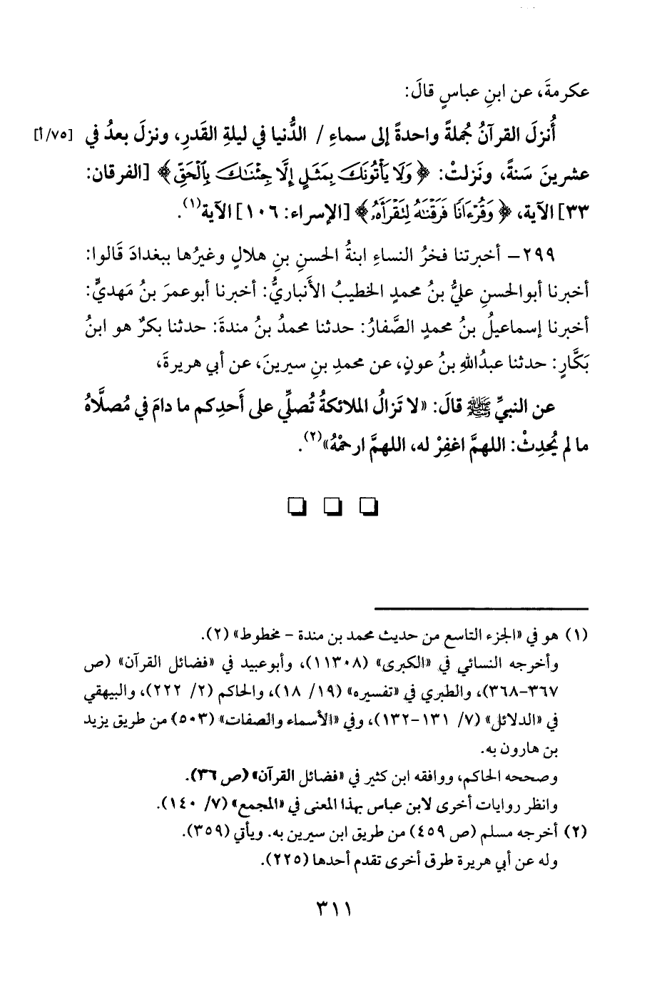 299 - أخبرتنا فخرُ النساءِ ابنةُ الحسنِ بنِ هلالٍ وغيرُها ببغدادَ قَالوا: أخبرنا أبو الحسنِ عليُّ بنُ محمدٍ الخطيبُ الأَنباريُّ: أخبرنا أبو عمرَ بنُ مَهديٍّ: أخبرنا إسماعيلُ بنُ محمدٍ الصَّفارُ: حدثنا محمدُ بنُ مندةَ: حدثنا بكرٌ هو ابنُ بَكَّارٍ: حدثنا عبدُ اللهِ بنُ عونٍ، عن محمدِ بنِ سيرينَ، عن أبي هريرةَ،