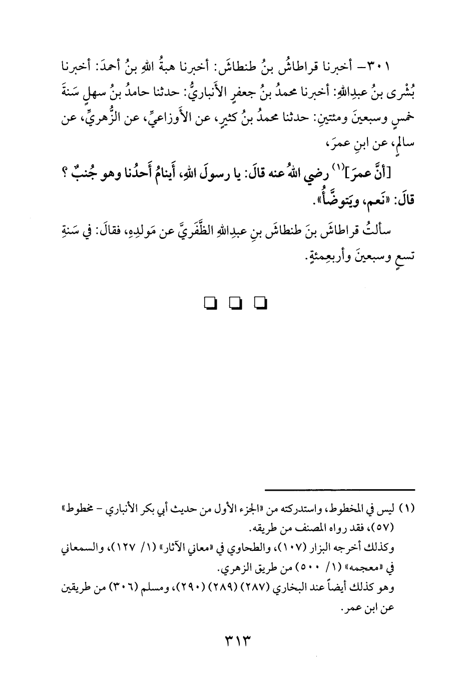 301 - أخبرنا قراطاشُ بنُ طنطاشَ: أخبرنا هبةُ اللهِ بنُ أحمدَ: أخبرنا بُشْرى بنُ عبدِ اللهِ: أخبرنا محمدُ بنُ جعفرٍ الأَنباريُّ: حدثنا حامدُ بنُ سهلٍ سَنةَ خمسٍ وسبعينَ ومئتينِ: حدثنا محمدُ بنُ كثيرٍ، عن الأَوزاعيِّ، عن الزُّهريِّ، عن سالمٍ، عن ابنِ عمرَ،