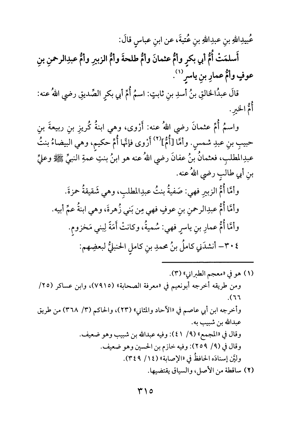 أَسلمَتْ أُمُّ أبي بكرٍ وأمُّ عثمانَ وأمُّ طلحةَ وأمُّ الزبيرِ وأمُّ عبدِ الرحمنِ بنِ عوفٍ وأمُّ عمارِ بنِ ياسرٍ (¬1).