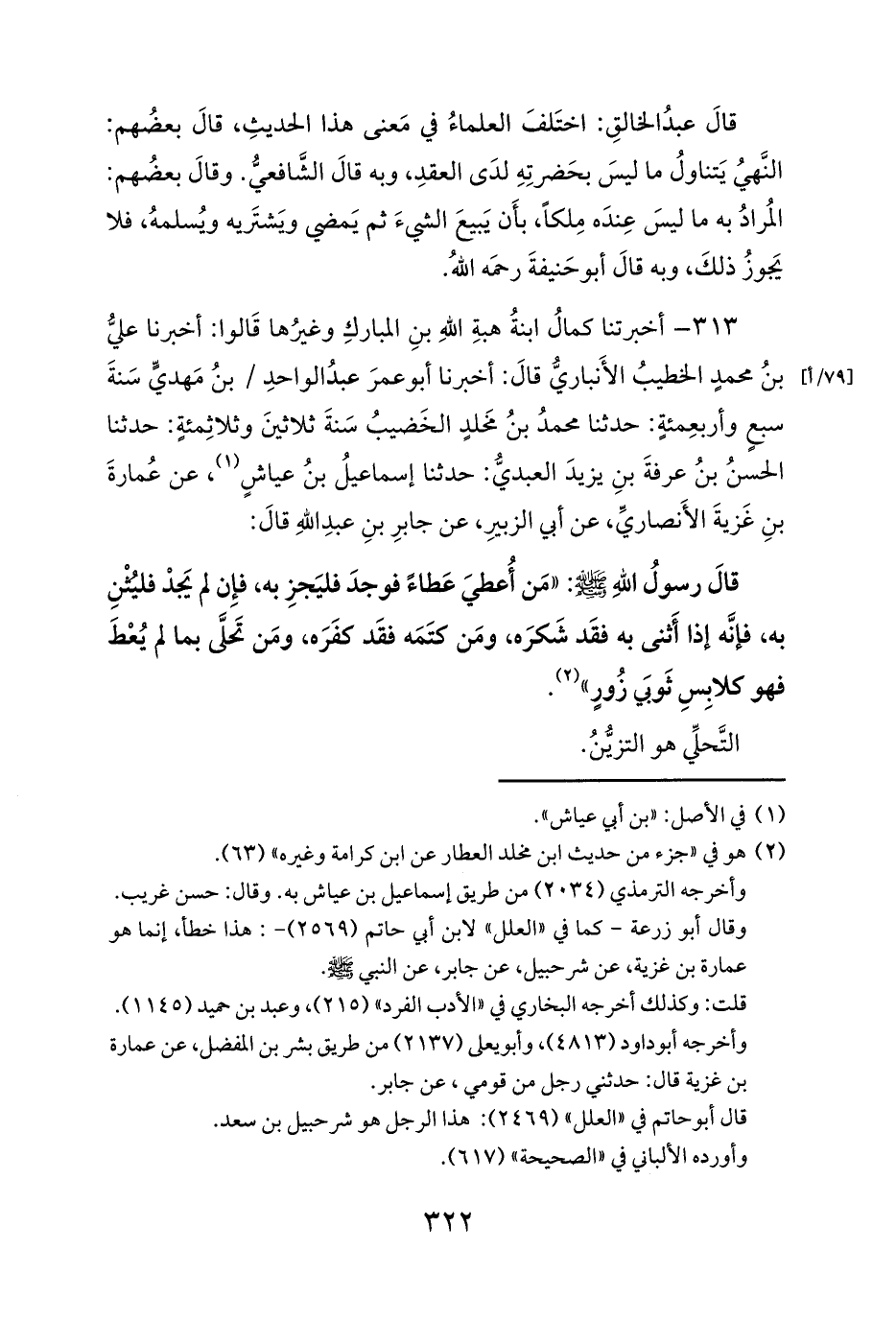 قالَ رسولُ اللهِ صلى الله عليه وسلم: «مَن أُعطيَ عَطاءً فوجدَ فليَجزِ به، فإِن لم يَجدْ فليُثْنِ به، فإنَّه إذا أَثنى به فقَد شَكرَه، ومَن كتَمَه فقَد كفَرَه، ومَن تَحلَّى بما لم يُعْطَ فهو كلابِسِ ثَوبَي زُورٍ» (¬2).