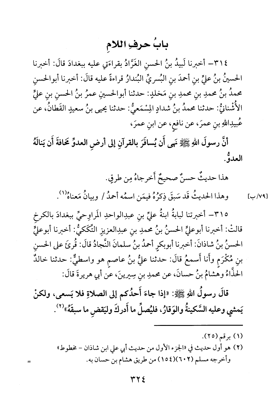 314 - أخبرنا لَبيدُ بنُ الحسنِ الغَرَّادُ بقراءَتي عليه ببغدادَ قالَ: أخبرنا الحسينُ بنُ عليِّ بنِ أحمدَ بنِ البُسريِّ البُندارُ قراءةً عليه قالَ: أخبرنا أبو الحسنِ محمدُ بنُ محمدِ بنِ محمدِ بنِ مَخلدٍ: حدثنا أبو الحسينِ عمرُ بنُ الحسنِ بنِ عليٍّ الأُشْنانيُّ: حدثنا محمدُ بنُ شدادٍ المِسْمَعيُّ: حدثنا يحيى بنُ سعيدٍ القَطانُ، عن عُبيدِ اللهِ بنِ عمرَ، عن نافعٍ، عن ابنِ عمرَ،