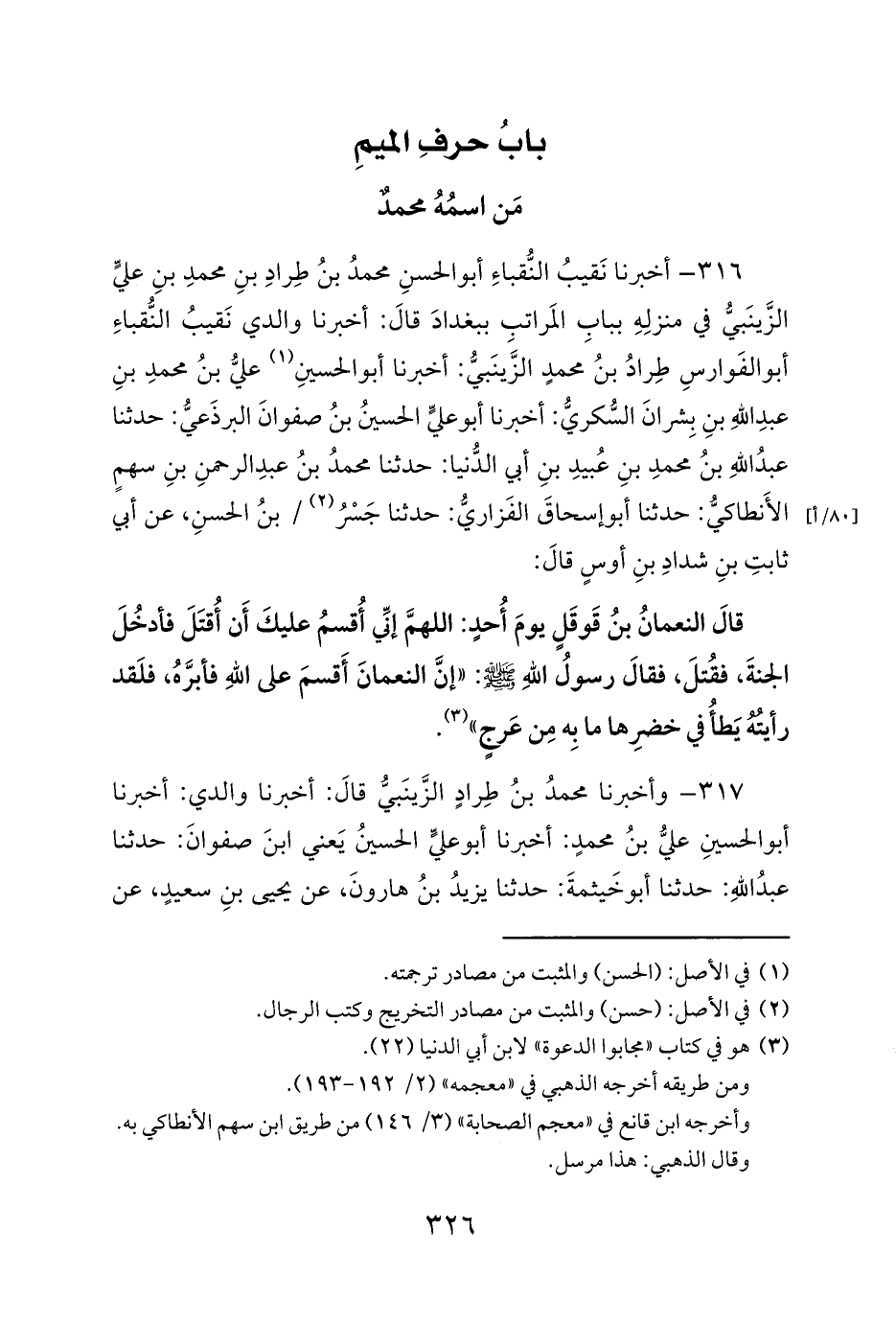 317 - وأخبرنا محمدُ بنُ طِرادٍ الزَّينَبيُّ قالَ: أخبرنا والدي: أخبرنا أبو الحسينِ عليُّ بنُ محمدٍ: أخبرنا أبو عليٍّ الحسينُ يَعني ابنَ صفوانَ: حدثنا عبدُ اللهِ: حدثنا أبو خَيثمةَ: حدثنا يزيدُ بنُ هارونَ، عن يحيى بنِ سعيدٍ، عن