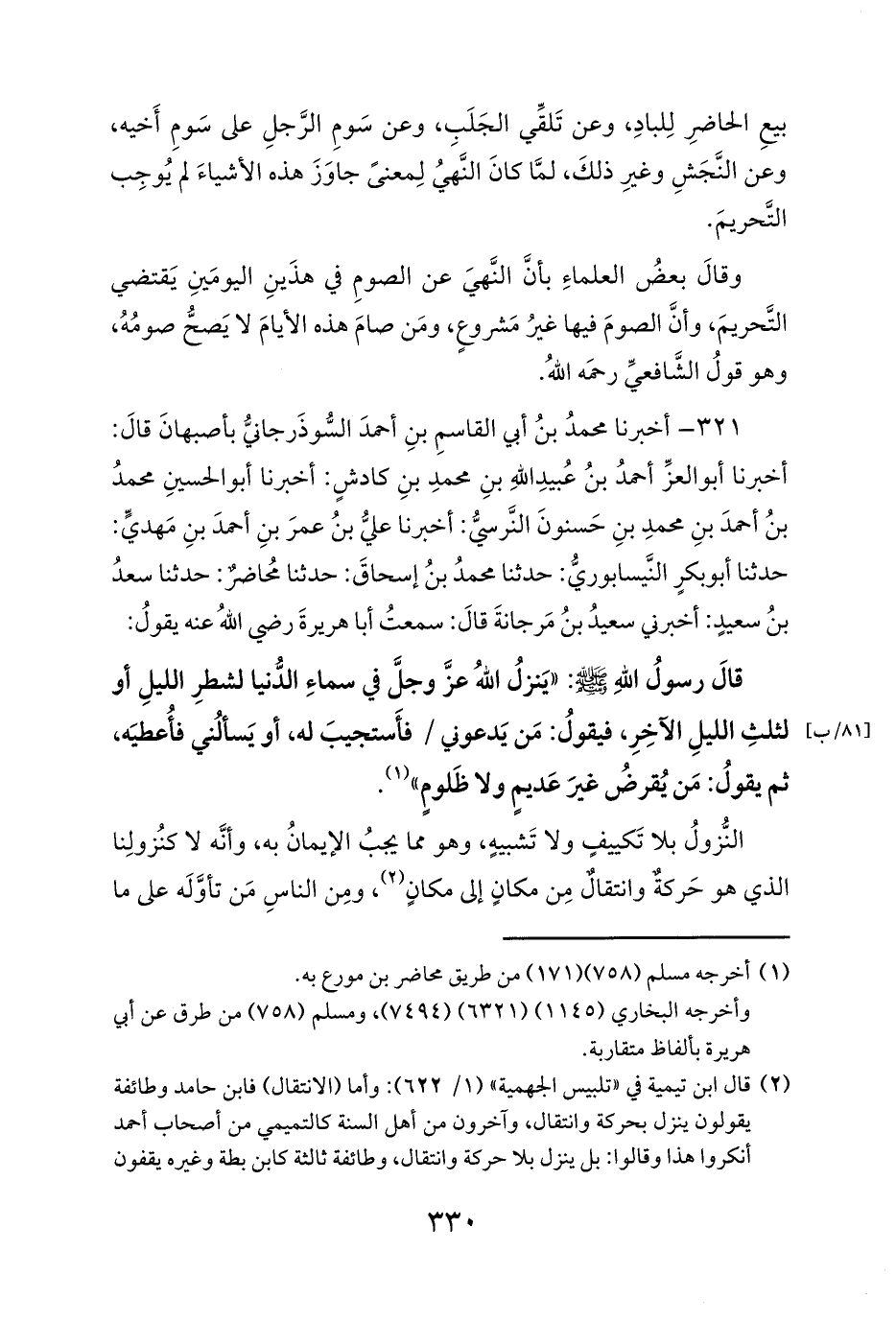 النُّزولُ بلا تَكييفٍ ولا تَشبيهٍ، وهو مما يجبُ الإيمانُ به، وأنَّه لا كنُزولِنا الذي هو حَركةٌ وانتقالٌ مِن مكانٍ إلى مكانٍ (¬2)، ومِن الناسِ مَن تأوَّلَه على ما