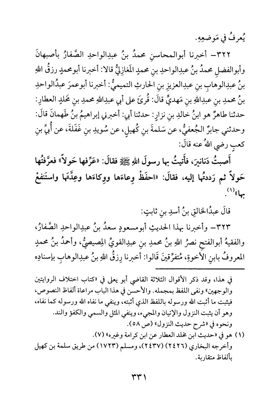 أَصبتُ دَنانيرَ، فأَتيتُ بها رسولَ اللهِ صلى الله عليه وسلم فقالَ: «عَرِّفها حَولاً» فعرَّفتُها حَولاً ثم رَددتُها إليه، فقالَ: «احفَظْ وِعاءَها ووِكاءَها وعِدَّتَها واستَنفعْ بها» (¬1).