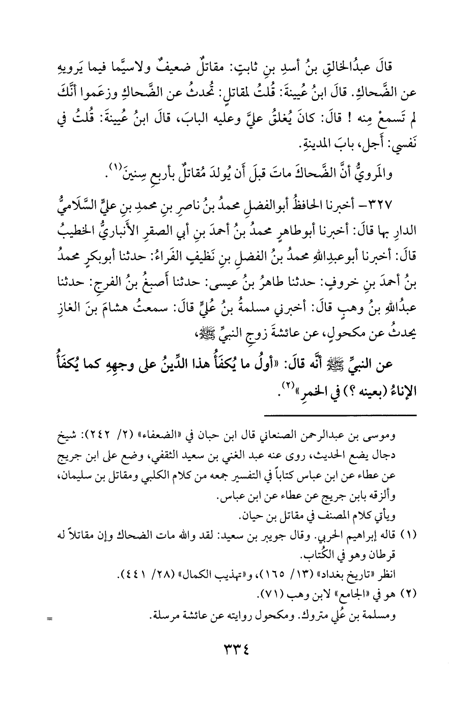 327 - أخبرنا الحافظُ أبو الفضلِ محمدُ بنُ ناصرِ بنِ محمدِ بنِ عليٍّ السَّلَاميُّ الدارِ بها قالَ: أخبرنا أبو طاهرٍ محمدُ بنُ أحمدَ بنِ أبي الصقرِ الأَنباريُّ الخطيبُ قالَ: أخبرنا أبو عبدِ اللهِ محمدُ بنُ الفضلِ بنِ نَظيفٍ الفَراءُ: حدثنا أبو بكرٍ محمدُ بنُ أحمدَ بنِ خروفٍ: حدثنا طاهرُ بنُ عيسى: حدثنا أَصبغُ بنُ الفرجِ: حدثنا عبدُ اللهِ بنُ وهبٍ قالَ: أخبرني مسلمةُ بنُ عُليٍّ قالَ: سمعتُ هشامَ بنَ الغازِ يحدثُ عن مكحولٍ، عن عائشةَ زوجِ النبيِّ صلى الله عليه وسلم،