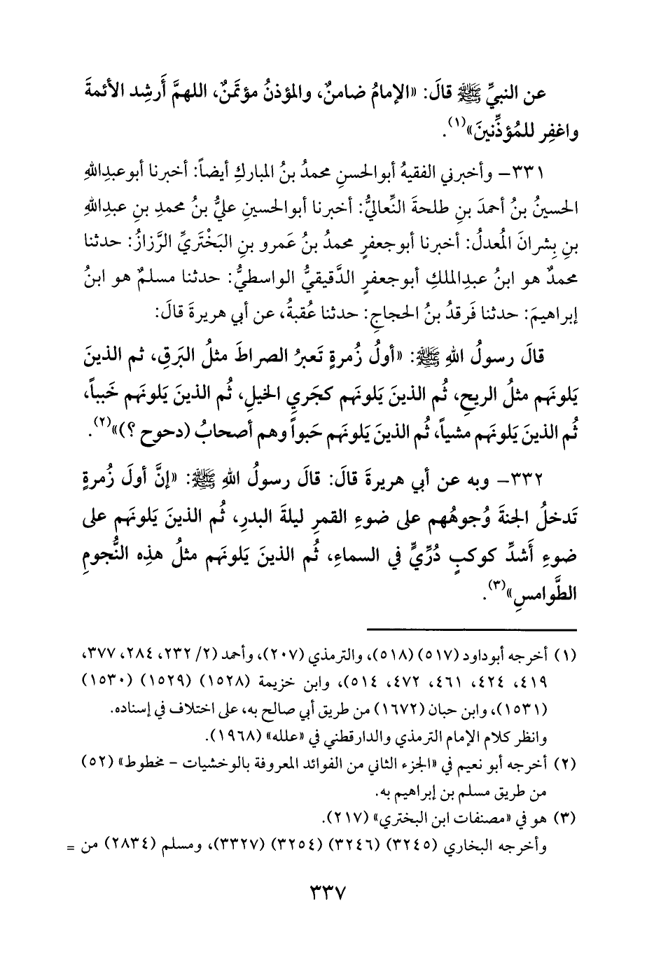 332 - وبه عن أبي هريرةَ قالَ: قالَ رسولُ اللهِ صلى الله عليه وسلم: «إنَّ أولَ زُمرةٍ تَدخلُ الجنةَ وُجوهُهم على ضوءِ القمرِ ليلةَ البدرِ، ثُم الذينَ يَلونَهم على ضوءِ أَشدِّ كوكبٍ دُرِّيٍّ في السماءِ، ثُم الذينَ يَلونَهم مثلُ هذِه النُّجومِ الطَّوامسِ» (¬3).