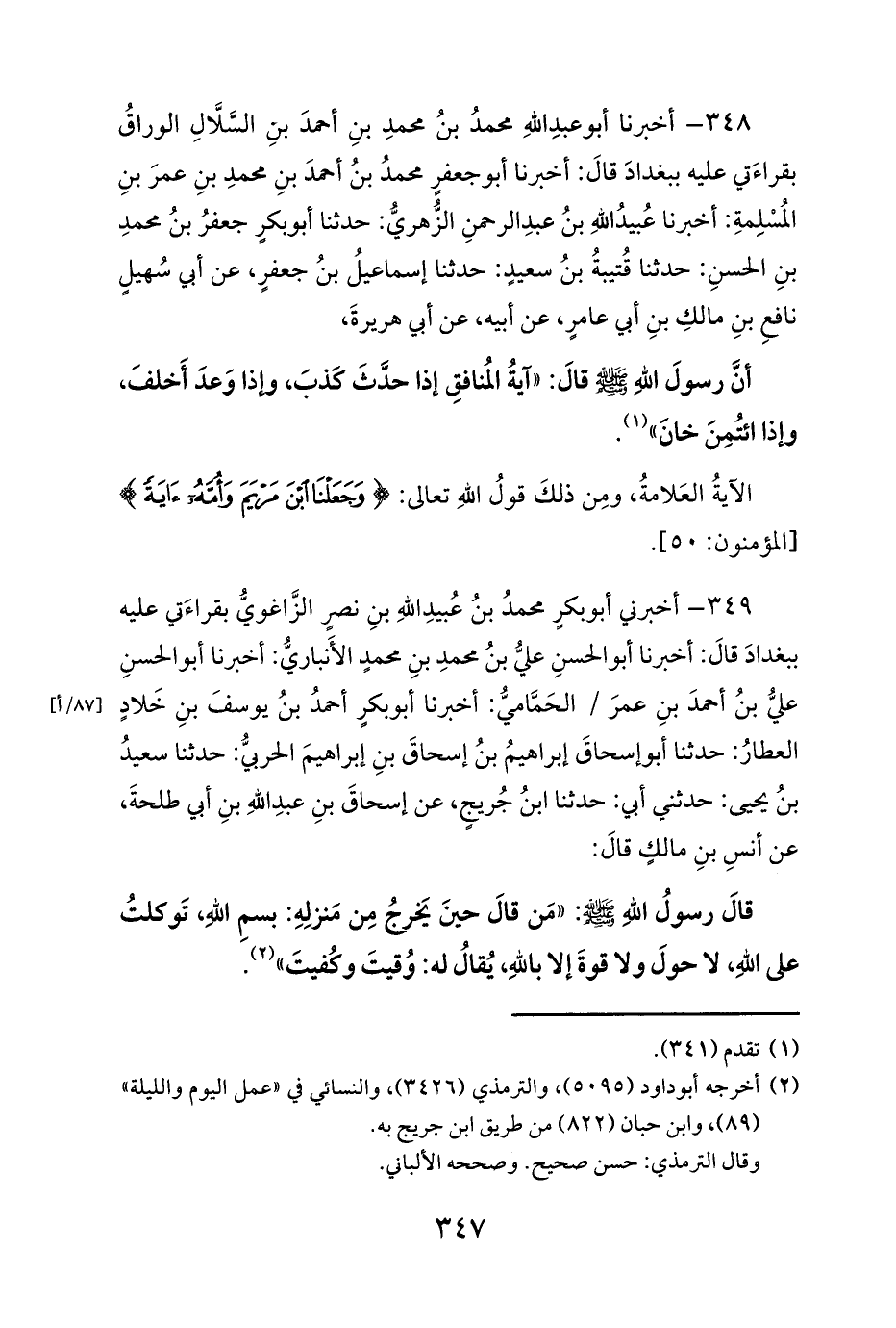 348 - أخبرنا أبو عبدِ اللهِ محمدُ بنُ محمدِ بنِ أحمدَ بنِ السَّلَّالِ الوراقُ بقراءَتي عليه ببغدادَ قالَ: أخبرنا أبو جعفرٍ محمدُ بنُ أحمدَ بنِ محمدِ بنِ عمرَ بنِ المُسْلِمةِ: أخبرنا عُبيدُ اللهِ بنُ عبدِ الرحمنِ الزُّهريُّ: حدثنا أبو بكرٍ جعفرُ بنُ محمدِ بنِ الحسنِ: حدثنا قُتيبةُ بنُ سعيدٍ: حدثنا إسماعيلُ بنُ جعفرٍ، عن أبي سُهيلٍ نافعِ بنِ مالكِ بنِ أبي عامرٍ، عن أبيه، عن أبي هريرةَ،