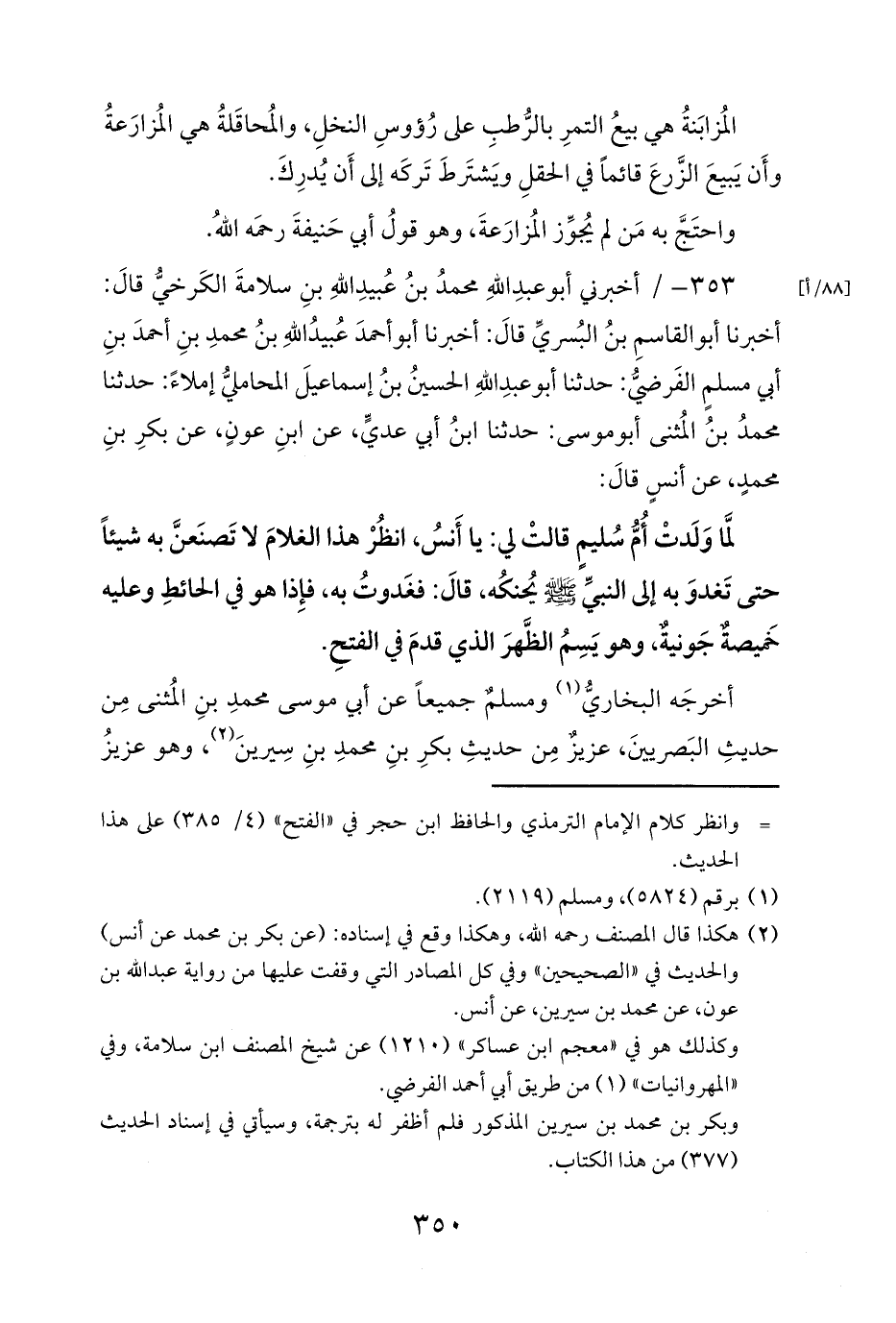 353 - / أخبرني أبو عبدِ اللهِ محمدُ بنُ عُبيدِ اللهِ بنِ سلامةَ الكَرخيُّ قالَ: أخبرنا أبو القاسمِ بنُ البُسريِّ قالَ: أخبرنا أبو أحمدَ عُبيدُ اللهِ بنُ محمدِ بنِ أحمدَ بنِ أبي مسلمٍ الفَرضيُّ: حدثنا أبو عبدِ اللهِ الحسينُ بنُ إسماعيلَ المحامليُّ إملاءً: حدثنا محمدُ بنُ المُثنى أبو موسى: حدثنا ابنُ أبي عديٍّ، عن ابنِ عونٍ، عن بكرِ بنِ محمدٍ، عن أنسٍ قالَ: