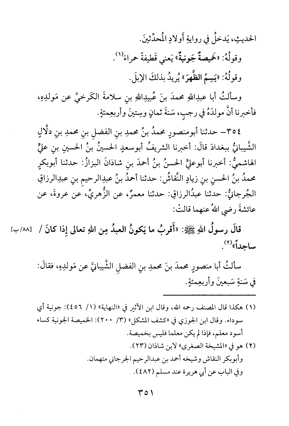 354 - حدثنا أبو منصورٍ محمدُ بنُ محمدِ بنِ الفضلِ بنِ محمدِ بنِ دلَّالٍ الشَّيبانيُّ ببغدادَ قالَ: أخبرنا الشريفُ أبو سعدٍ الحسينُ بنُ الحسينِ بنِ عليٍّ الهاشميُّ: أخبرنا أبو عليٍّ الحسنُ بنُ أحمدَ بنِ شاذانَ البزازُ: حدثنا أبو بكرٍ محمدُ بنُ الحسنِ بنِ زيادٍ النَّقاشُ: حدثنا أحمدُ بنُ عبدِ الرحيمِ بنِ عبدِ الرزاقِ الجُرجانيُّ: حدثنا عبدُ الرزاقِ: حدثنا معمرٌ، عن الزُّهريِّ، عن عروةَ، عن عائشةَ رضي اللهُ عنهما قالتْ: