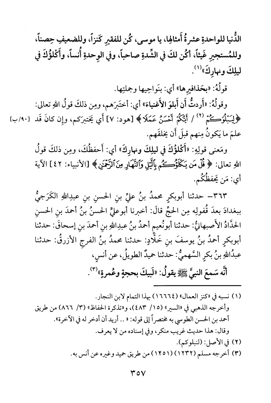 363 - حدثنا أبو بكرٍ محمدُ بنُ عليِّ بنِ الحسنِ بنِ عبدِ اللهِ الكَرَجيُّ ببغدادَ بعدَ قُفولِه مِن الحجِّ قالَ: أخبرنا أبو عليٍّ الحسنُ بنُ أحمدَ بنِ الحسنِ الحدَّادُ الأَصبهانيُّ: حدثنا أبو نُعيمٍ أحمدُ بنُ عبدِ اللهِ بنِ أحمدَ بنِ إسحاقَ: حدثنا أبو بكرٍ أحمدُ بنُ يوسفَ بنِ خَلَّادٍ: حدثنا محمدُ بنُ الفرجِ الأزرقُ: حدثنا عبدُ اللهِ بنُ بكرٍ السَّهميُّ: حدثنا حميدٌ الطويلُ، عن أنسٍ،