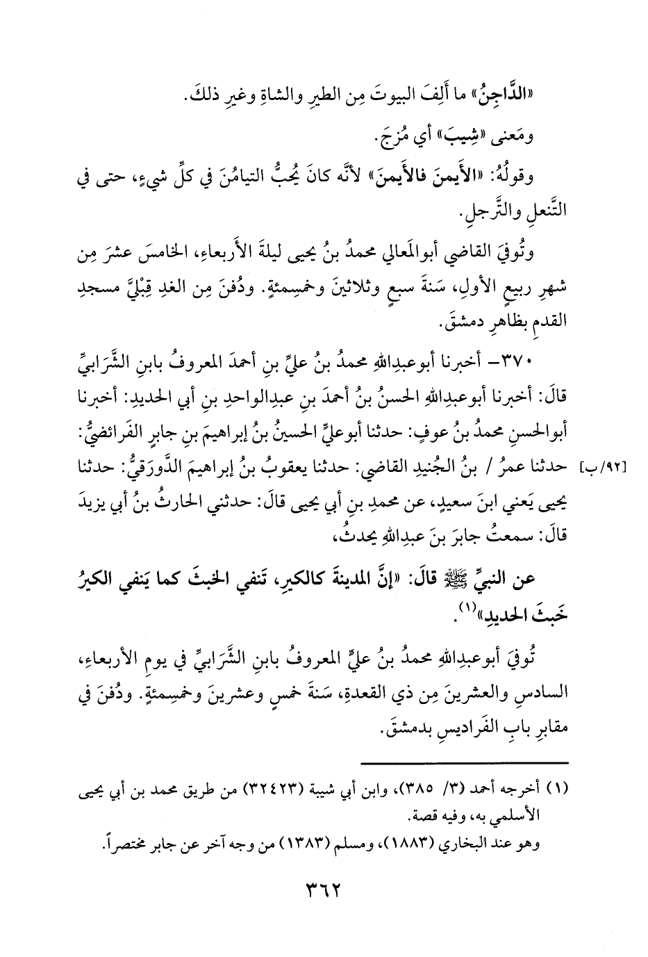 370 - أخبرنا أبو عبدِ اللهِ محمدُ بنُ عليِّ بنِ أحمدَ المعروفُ بابنِ الشَّرَابيِّ قالَ: أخبرنا أبو عبدِ اللهِ الحسنُ بنُ أحمدَ بنِ عبدِ الواحدِ بنِ أبي الحديدِ: أخبرنا أبو الحسنِ محمدُ بنُ عوفٍ: حدثنا أبو عليٍّ الحسينُ بنُ إبراهيمَ بنِ جابرٍ الفَرائضيُّ: حدثنا عمرُ / بنُ الجُنيدِ القاضي: حدثنا يعقوبُ بنُ إبراهيمَ الدَّورَقيُّ: حدثنا يحيى يَعني ابنَ سعيدٍ، عن محمدِ بنِ أبي يحيى قالَ: حدثني الحارثُ بنُ أبي يزيدَ قالَ: سمعتُ جابرَ بنَ عبدِ اللهِ يحدثُ،