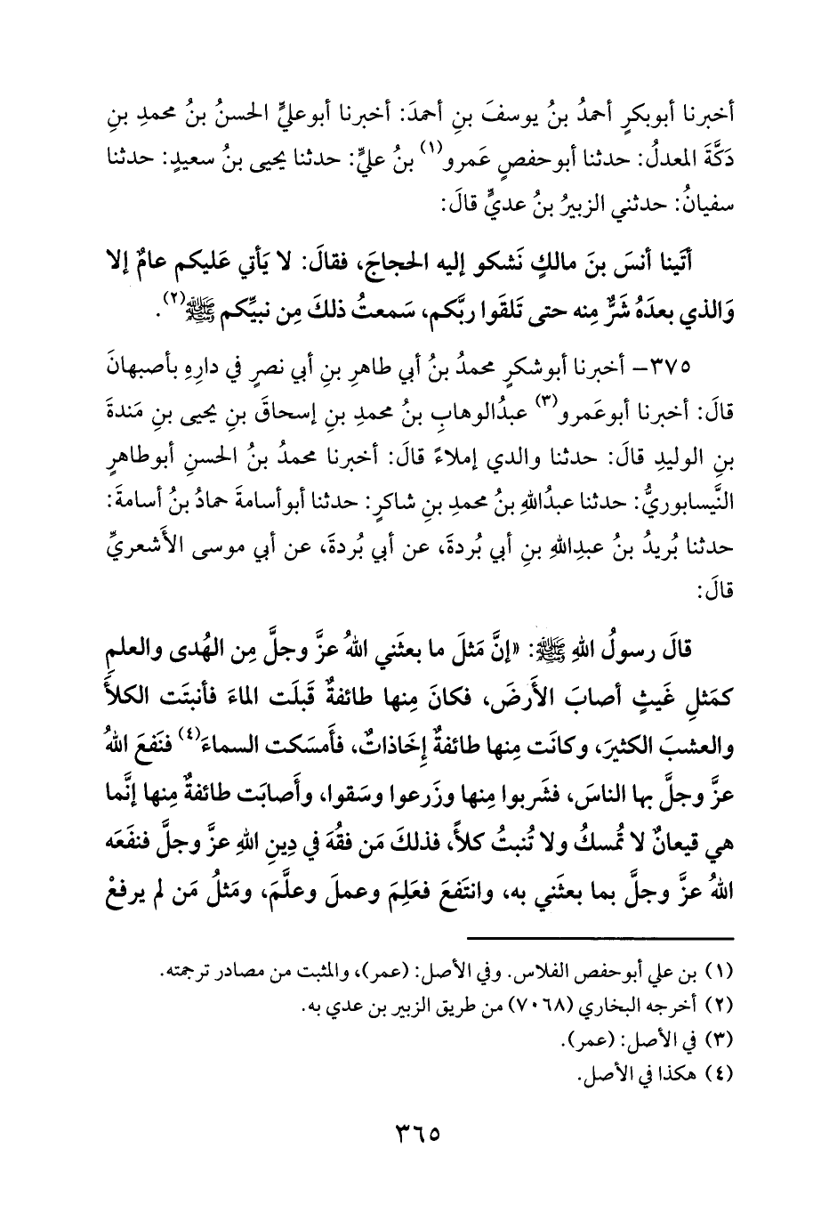 قالَ رسولُ اللهِ صلى الله عليه وسلم: «إنَّ مَثلَ ما بعثَني اللهُ عزَّ وجلَّ مِن الهُدى والعلمِ كمَثلِ غَيثٍ أصابَ الأَرضَ، فكانَ مِنها طائفةٌ قَبلَت الماءَ فأنبتَت الكلأَ والعشبَ الكثيرَ، وكانَت مِنها طائفةٌ إِخَاذاتٌ، فأَمسَكت السماءَ (¬4) فنَفعَ اللهُ عزَّ وجلَّ بها الناسَ، فشَربوا مِنها وزَرعوا وسَقوا، وأَصابَت طائفةٌ مِنها إنَّما هي قيعانٌ لا تُمسكُ ولا تُنبتُ كلأً، فذلكَ مَن فقُهَ في دِينِ اللهِ عزَّ وجلَّ فنفَعَه اللهُ عزَّ وجلَّ بما بعثَني به، وانتَفعَ فعَلِمَ وعملَ وعلَّمَ، ومَثلُ مَن لم يرفعْ