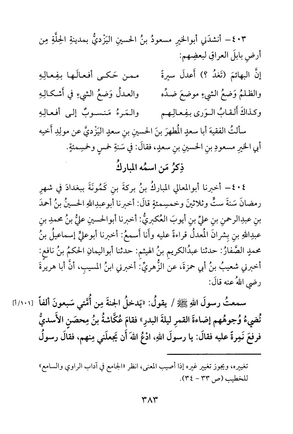 404 - أخبرنا أبو المعالي المباركُ بنُ بركةَ بنِ كَمُونَةَ ببغدادَ في شهرِ رمضانَ سَنةَ ستٍّ وثلاثينَ وخمسِمئةٍ قالَ: أخبرنا أبو عبدِ اللهِ الحسينُ بنُ أحمدَ بنِ عبدِ الرحمنِ بنِ عليِّ بنِ أيوبَ العُكبريُّ: أخبرنا أبو الحسينِ عليُّ بنُ محمدِ بنِ عبدِ اللهِ بنِ بِشرانَ المُعدلُ قراءةً عليه وأَنا أَسمعُ: أخبرنا أبو عليٍّ إسماعيلُ بنُ محمدٍ الصَّفارُ: حدثنا عبدُ الكريمِ بنُ الهيثمِ: حدثنا أبو اليمانِ الحكمُ بنُ نافعٍ: أخبرني شعيبُ بنُ أبي حمزةَ، عن الزُّهريِّ: أخبرني ابنُ المسيبِ، أنَّ أبا هريرةَ رضي اللهُ عنه قالَ: