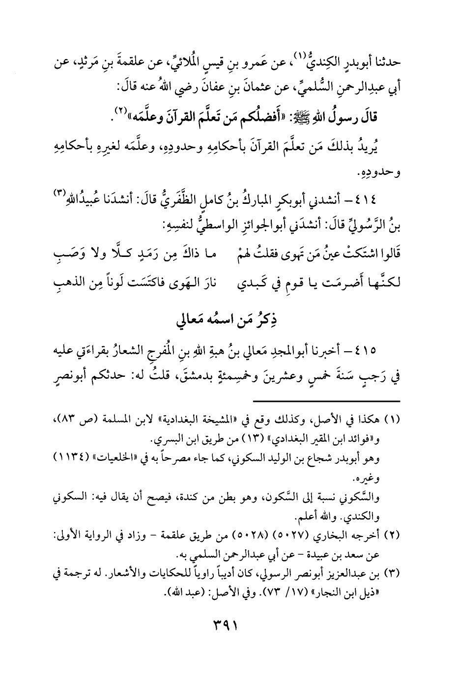 415 - أخبرنا أبو المجدِ مَعالي بنُ هبةِ اللهِ بنِ المُفرجِ الشعارُ بقراءَتي عليه في رَجبٍ سَنةَ خمسٍ وعشرينَ وخمسِمئةٍ بدمشقَ، قلتُ له: حدثكم أبو نصرٍ