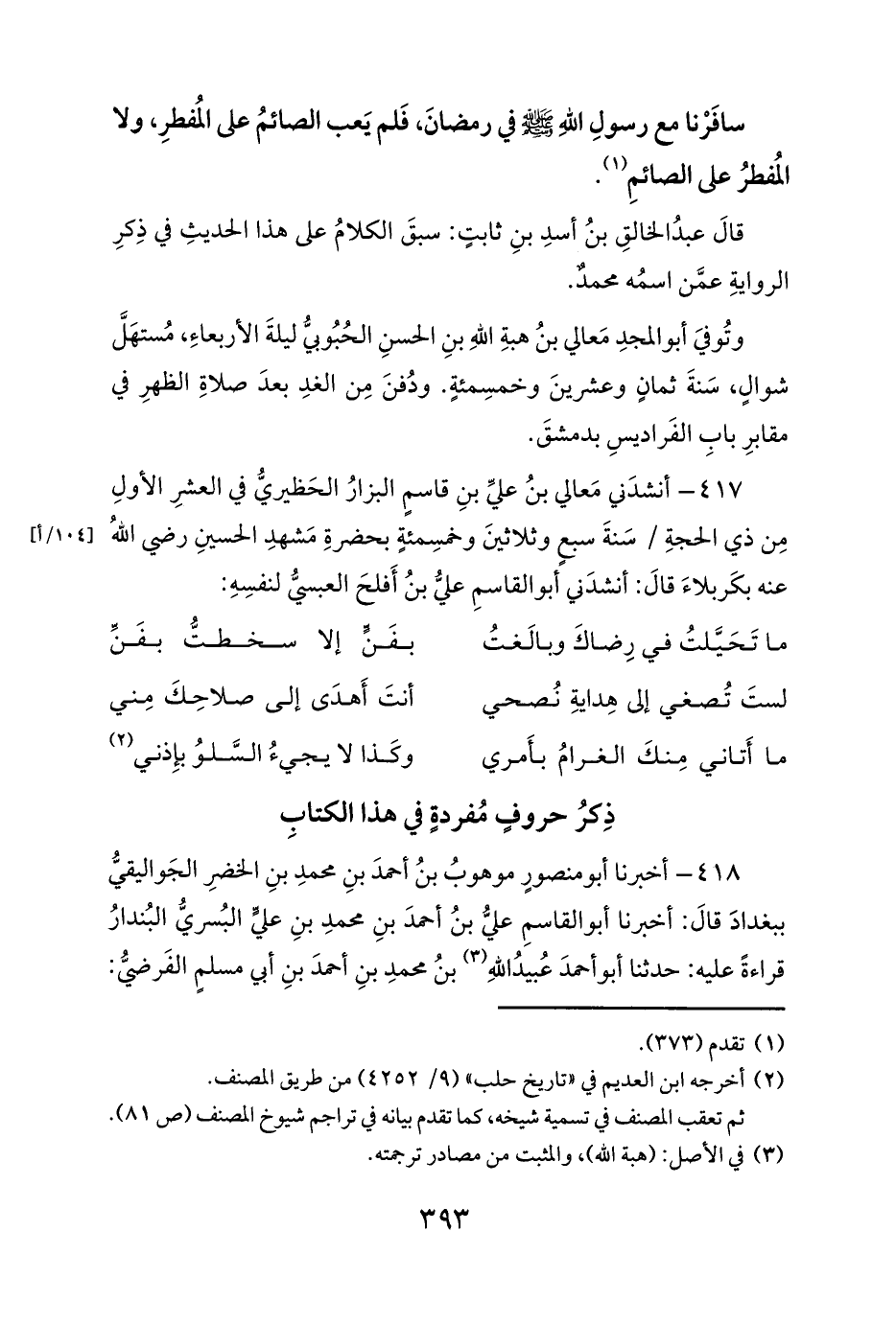 417 - أنشدَني مَعالي بنُ عليِّ بنِ قاسمٍ البزارُ الحَظيريُّ في العشرِ الأولِ مِن ذي الحجةِ / سَنةَ سبعٍ وثلاثينَ وخمسِمئةٍ بحضرةِ مَشهدِ الحسينِ رضي اللهُ عنه بكَربلاءَ قالَ: أنشدَني أبو القاسمِ عليُّ بنُ أَفلحَ العبسيُّ لنفسِهِ:
